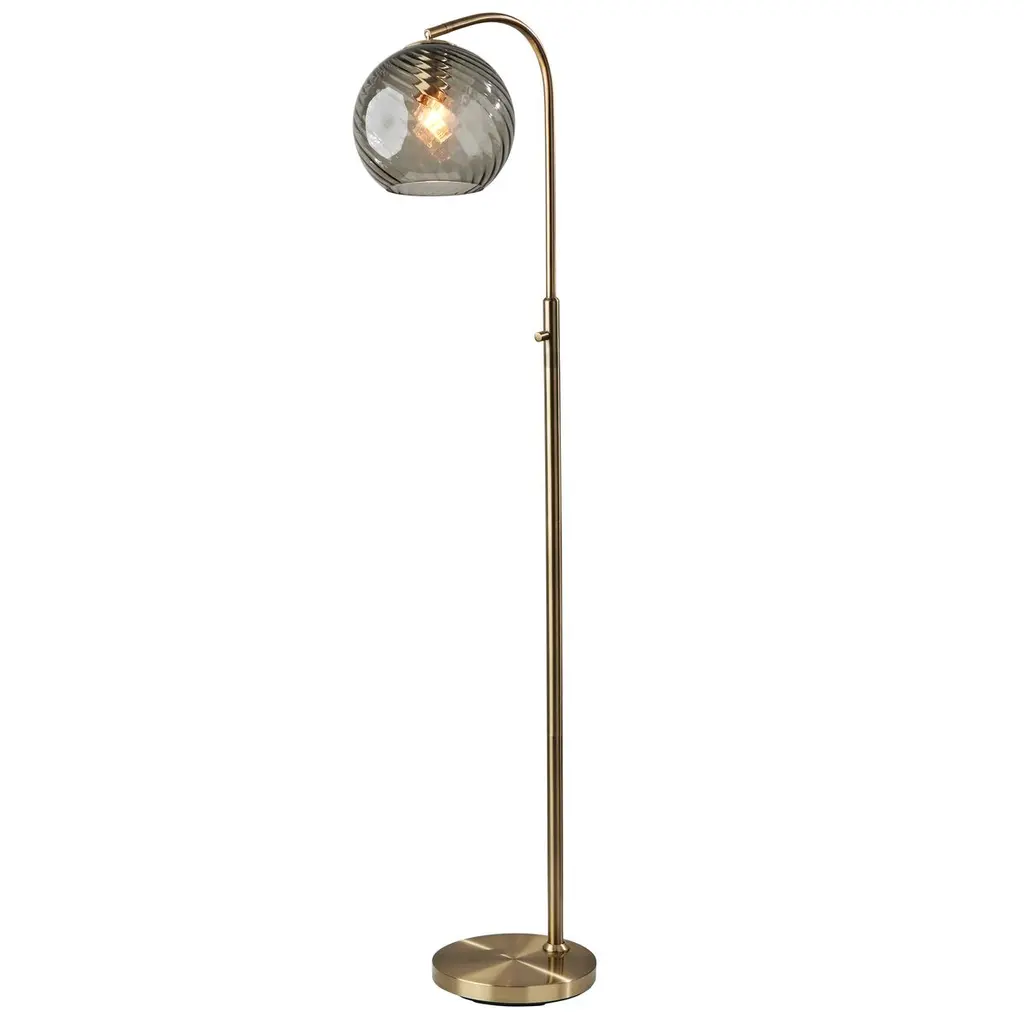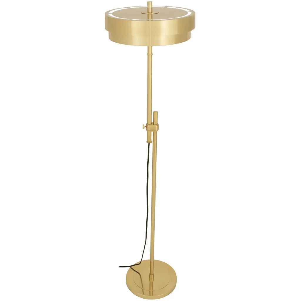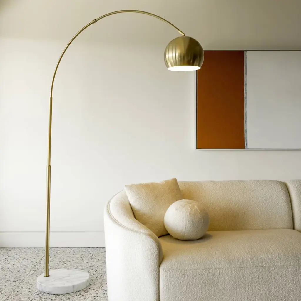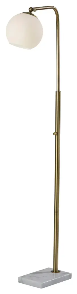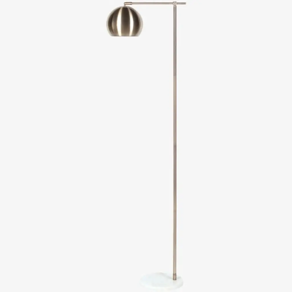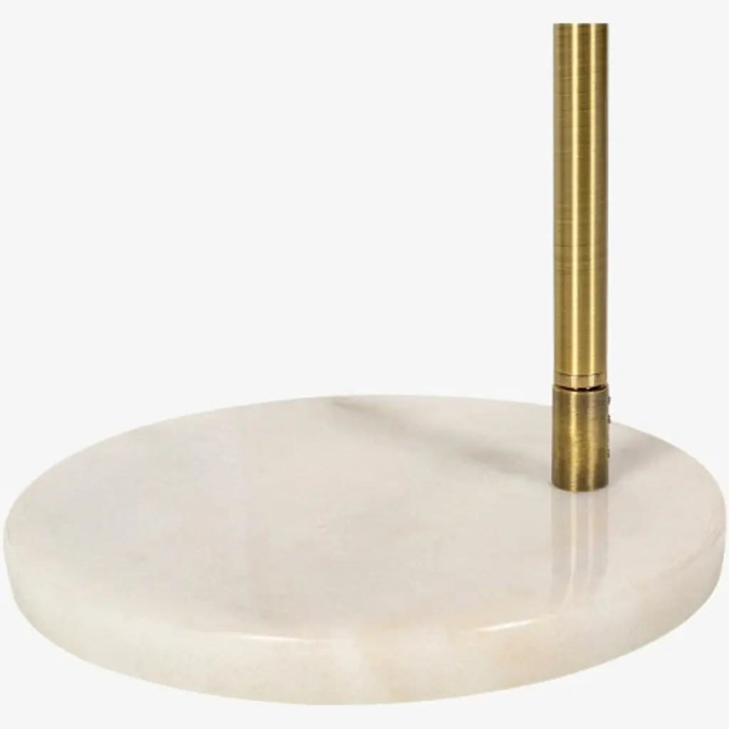 The epitome of modern style, the Bacall Floor Lamp showcases a white marble base, angular polished metal frame, and circular shade. Perfect to illuminate your living room, office, or bedroom.