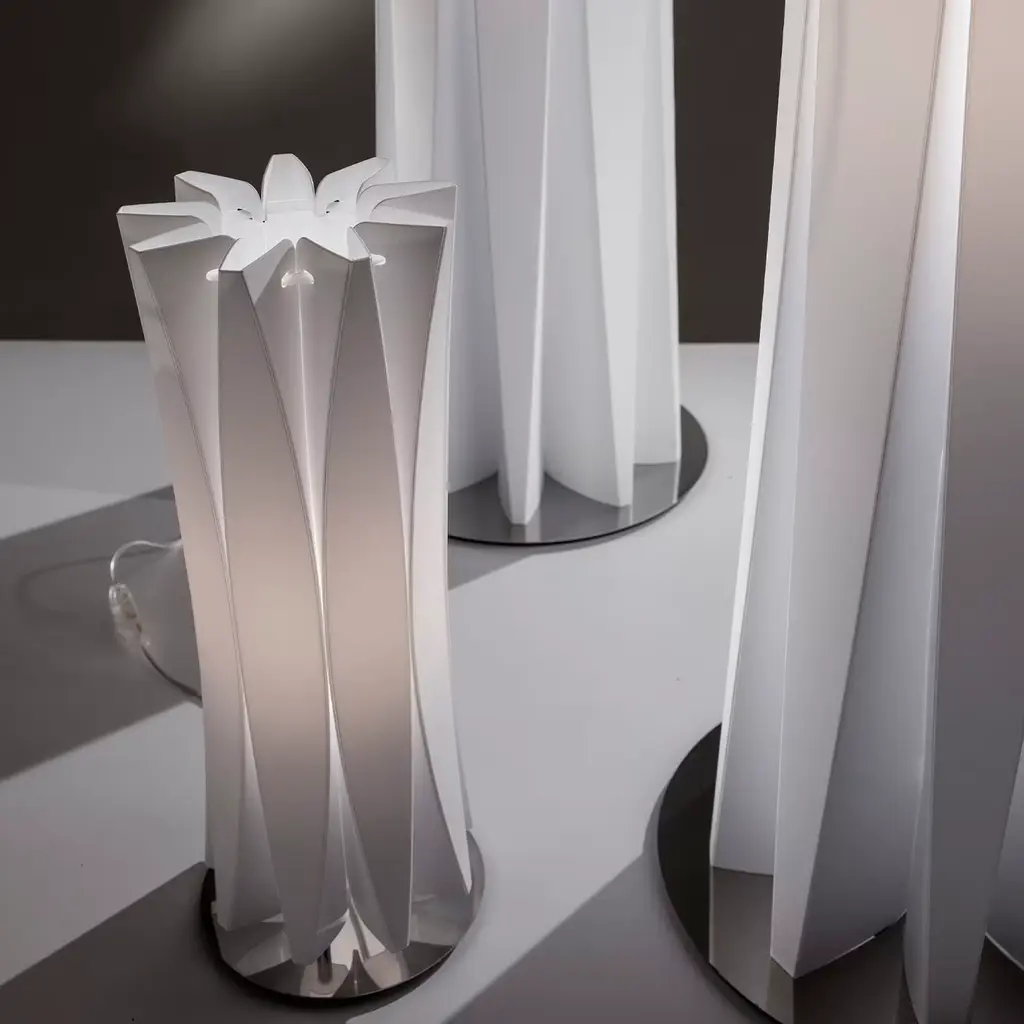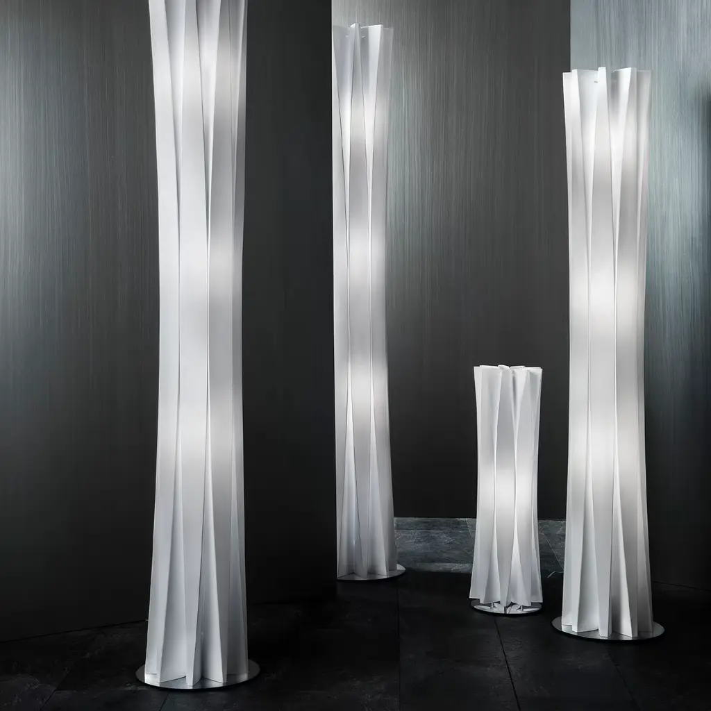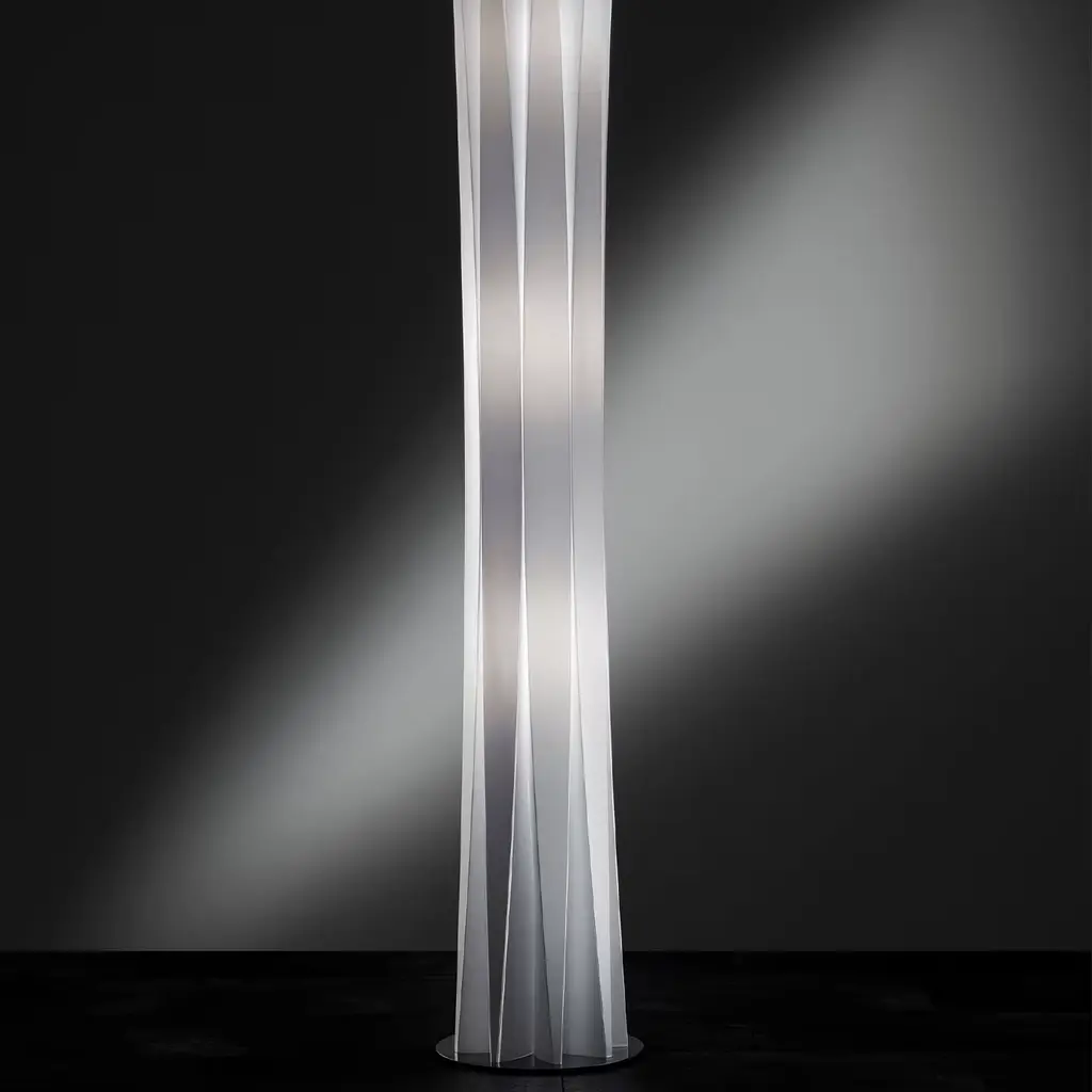 Taking elegance to the next level, this sculptural floor lamp of the Bach Collection will complement a sophisticated living room, foyer, or office. Its luminous silhouette of white Opalflex® is raised on a round stainless steel base and the light source contained inside reflects through its alluring geometric profile and symmetrical folds creating a soft atmosphere. This exclusive design by Francesco Paretti is also available in gold, different sizes, and table variant upon request to the Concierge.