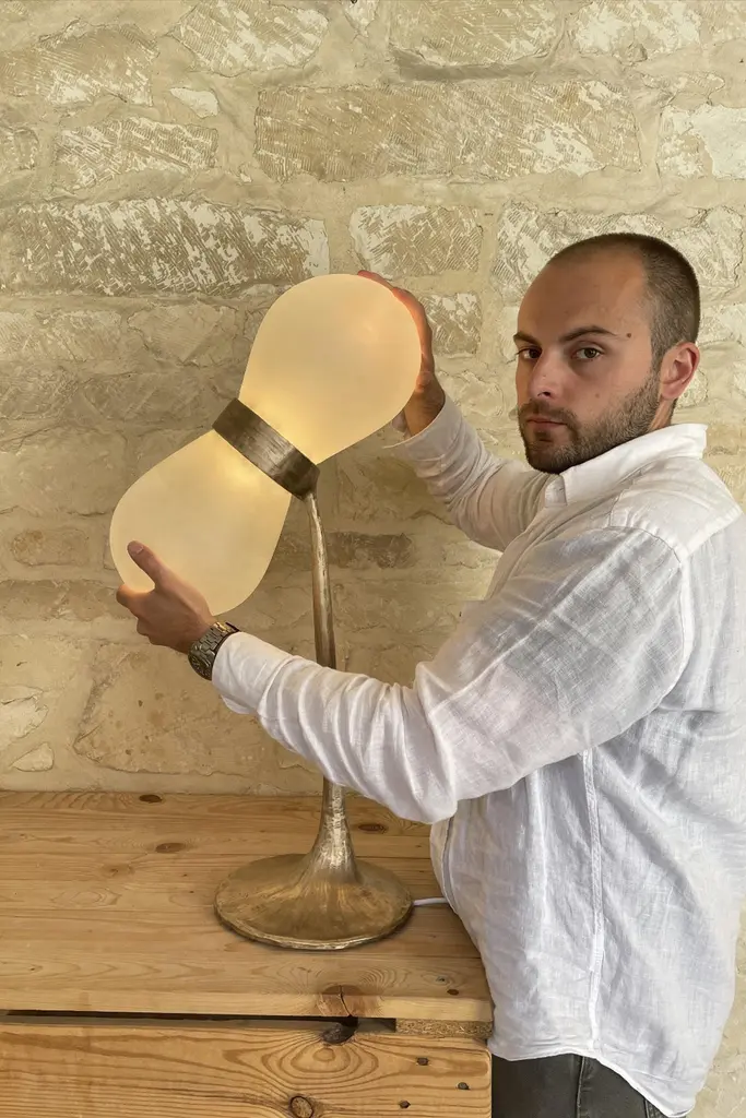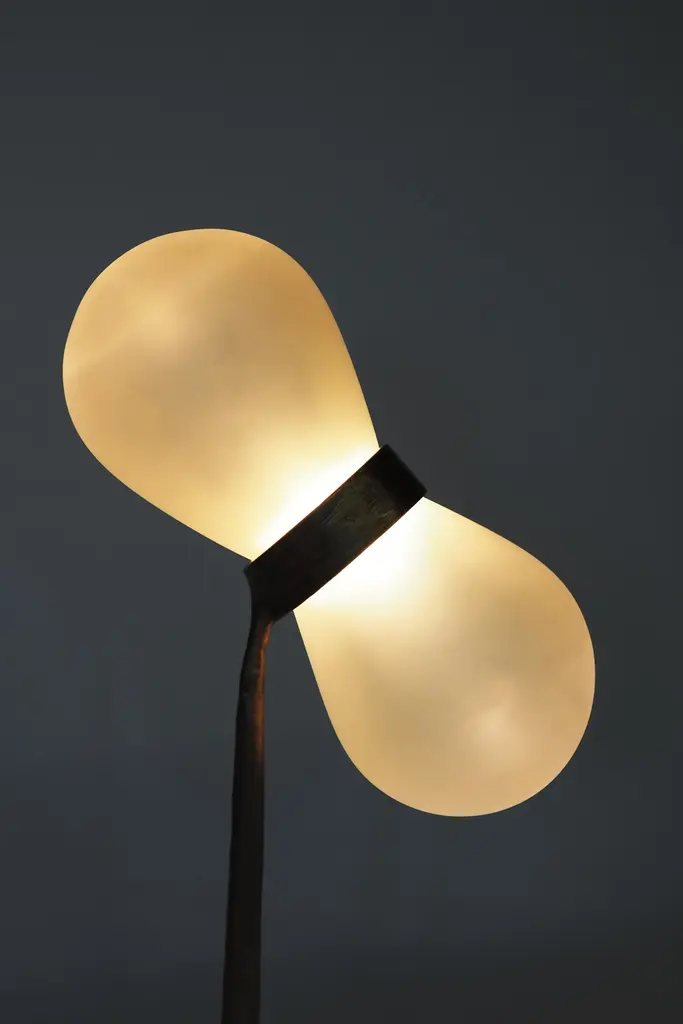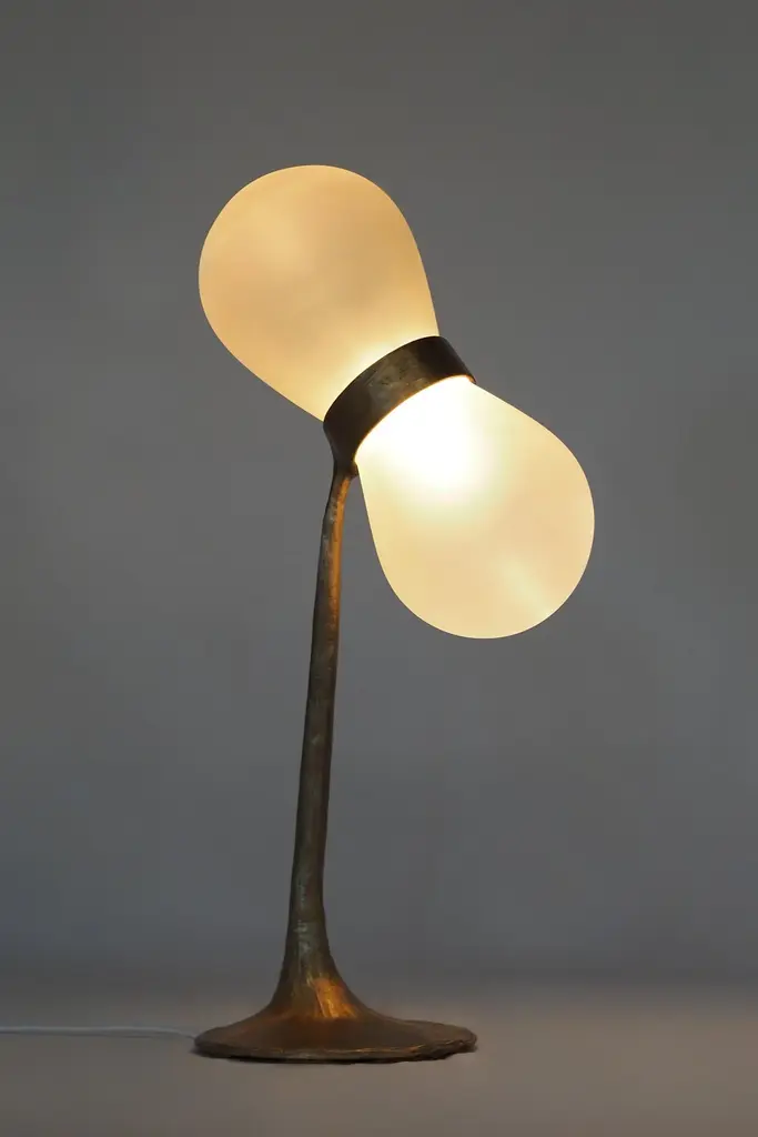 Bacupari Lamp by Clément ThevenotLimited Edition Of 12 Pieces.Designed by Clément Thevenot and Joyce Broussillou.Dimensions: D 26 x W 26 x H 84,5 cm.Materials: Cast bronze, sandblasted glass, heat-resistant plastic system, driver and 24v LED.Each copy is unique, has variable dimensions due to the craft techniques used. Handmade in France between traditionally blown glassware, the brass foundry and the designer’s studio. Signed, serial number and certifcate of authenticity. Available in textured black patina, textured antique patina and nickel bronze. Glass options: white pattern glass and white opale glass. Custom size and finishes on demand. Please contact us.All our lamps can be wired according to each country. If sold to the USA it will be wired for the USA for instance.Clément Thevenot is a French designer born in Normandy in 2000, Joyce a French designer born in 1999 in Marne.Following a dual course of study between the École Supérieure de design de Troyes and the Pontifical University of Rio de Janeiro, training which will continue to inspire them in their work.Clément runs a multidisciplinary studio where Art, Crafts and design meet.The pair were employed as designers in two separate companies.Joyce for La Rochère glassworks and Clément for Macheret foundry, this will be the genesis of the Archipel project.In 2020, the duo worked alongside Vincent Dubourg as part of an internship. It was an important experience in their career, they discovered a new way of thinking and making objects.Projects that go beyond the sole function to bring vitality into our lives. A work where the border between Art and Design blurs to give way to singular objects merging with the space around man.Inspired by the work of members of Radical Design for their critical look at our way of designing and consuming objects; the young designer plans to build a domestic world participating in the collective imagination, freeing us from rationality and standardization.