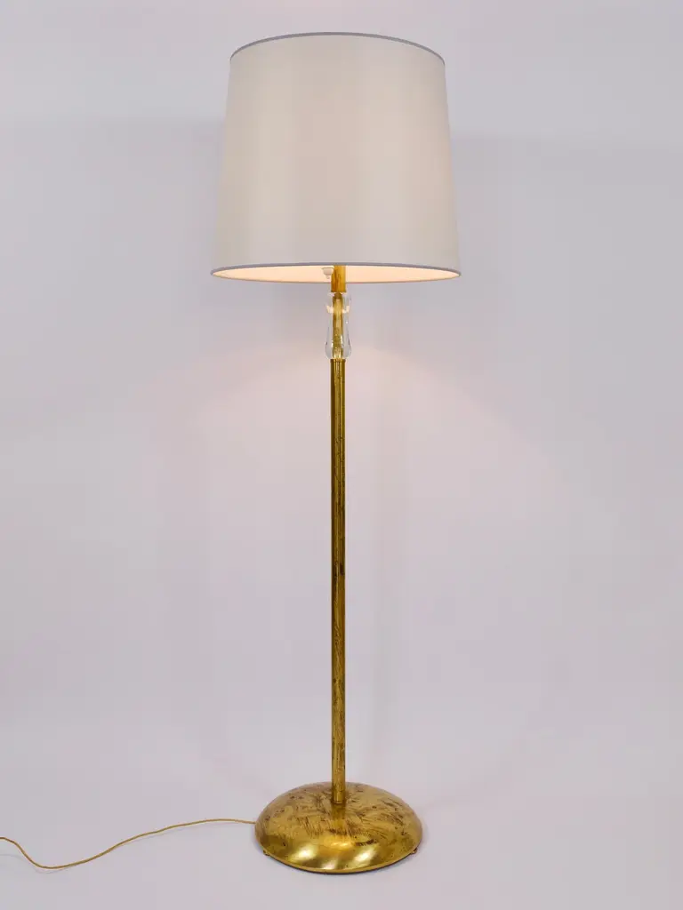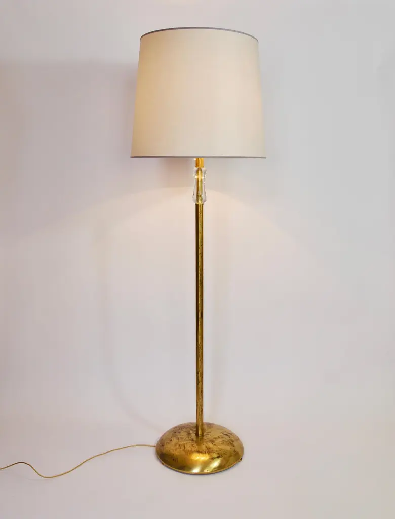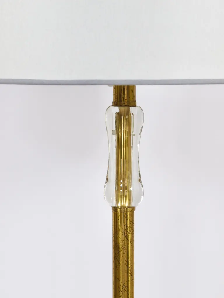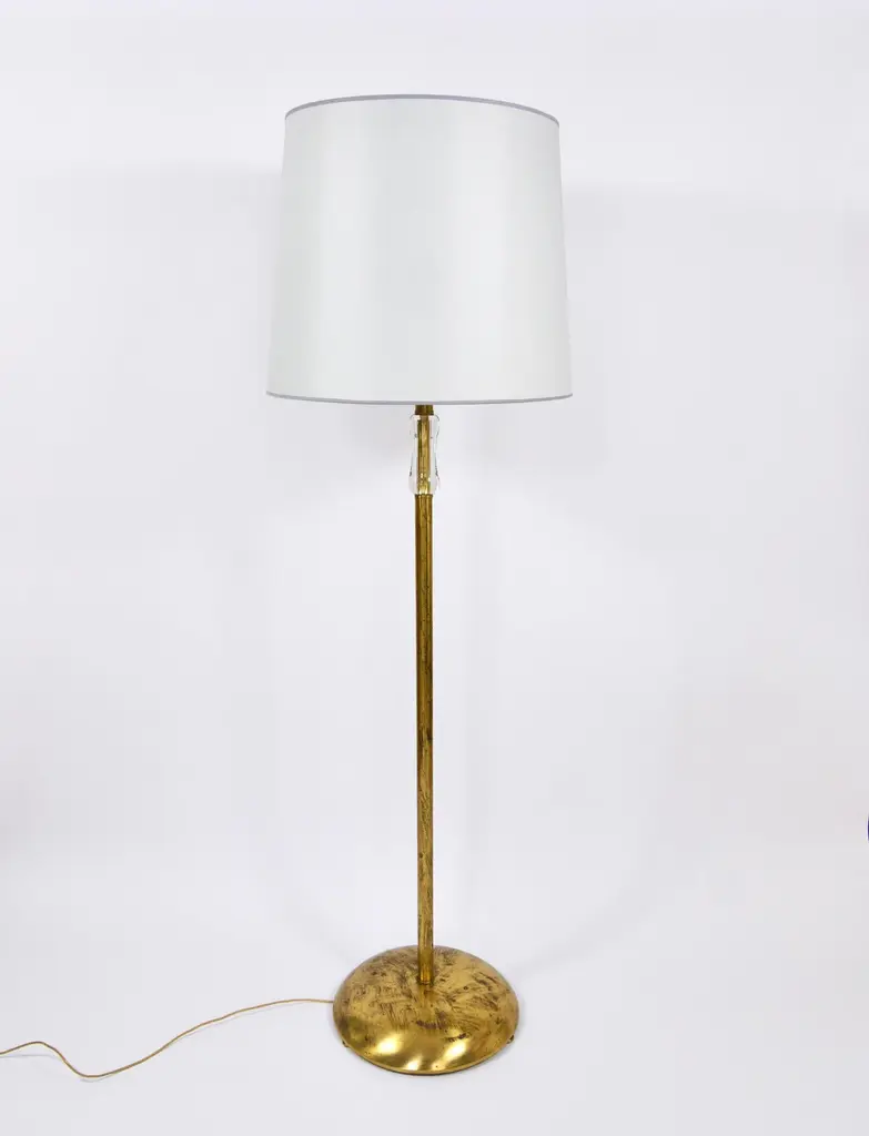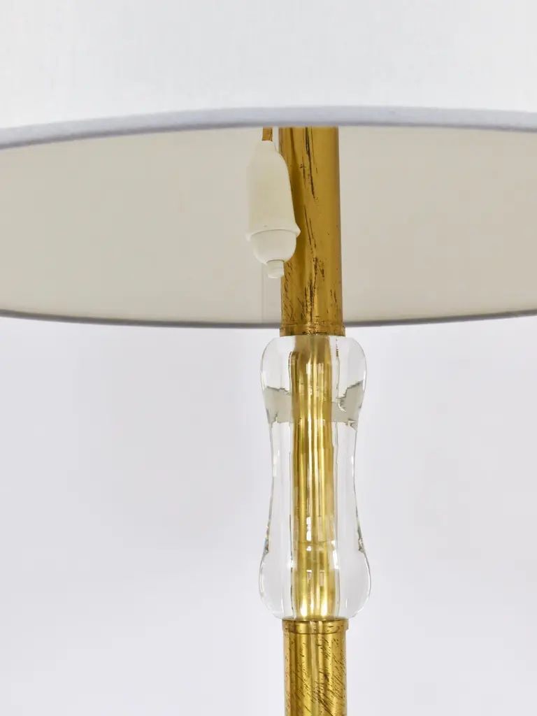 A monumental and elegant Mid-Century brass floor lamp from the 1950s, designed and executed by Bakalowits & Söhne in Vienna, Austria. Expertly crafted from brass, this lamp features a 20-inch diameter lampshade and a round base with charming small feet. The true highlight, however, is the stunning handle made of thick, solid glass. Not only does it add a striking visual element, but it also beautifully reflects the light. The lamp has developed a gorgeous patina over the decades, enhancing its vintage charm. The lamp offers two light sources and has been newly rewired with golden textile cord while preserving the original switch located beneath the shade. The lampshade has been professionally restored in a refined, elegant light grey fabric, with the original frame carefully maintained to ensure its authentic proportions and measurements.