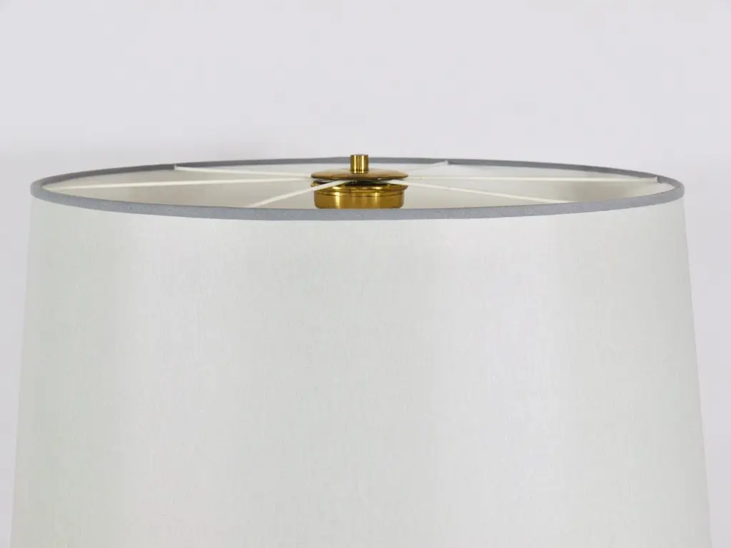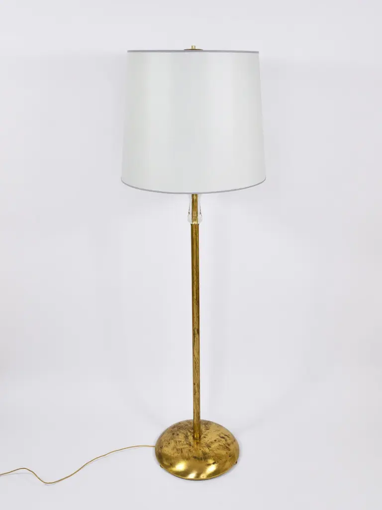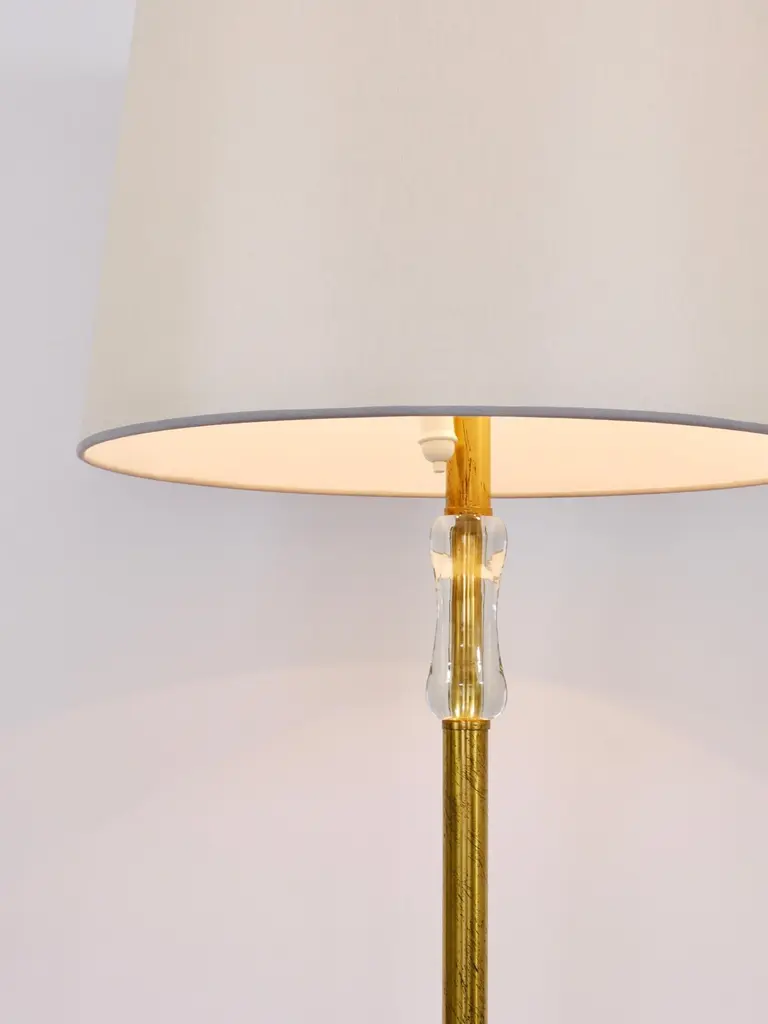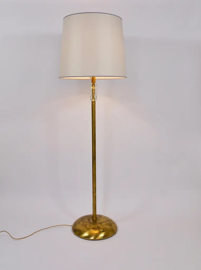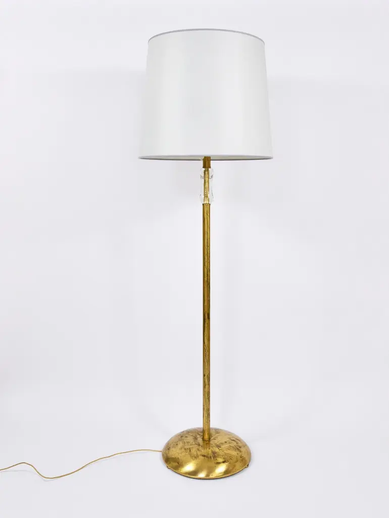 A monumental and elegant Mid-Century brass floor lamp from the 1950s, designed and executed by Bakalowits & Söhne in Vienna, Austria. Expertly crafted from brass, this lamp features a 20-inch diameter lampshade and a round base with charming small feet. The true highlight, however, is the stunning handle made of thick, solid glass. Not only does it add a striking visual element, but it also beautifully reflects the light. The lamp has developed a gorgeous patina over the decades, enhancing its vintage charm. The lamp offers two light sources and has been newly rewired with golden textile cord while preserving the original switch located beneath the shade. The lampshade has been professionally restored in a refined, elegant light grey fabric, with the original frame carefully maintained to ensure its authentic proportions and measurements.