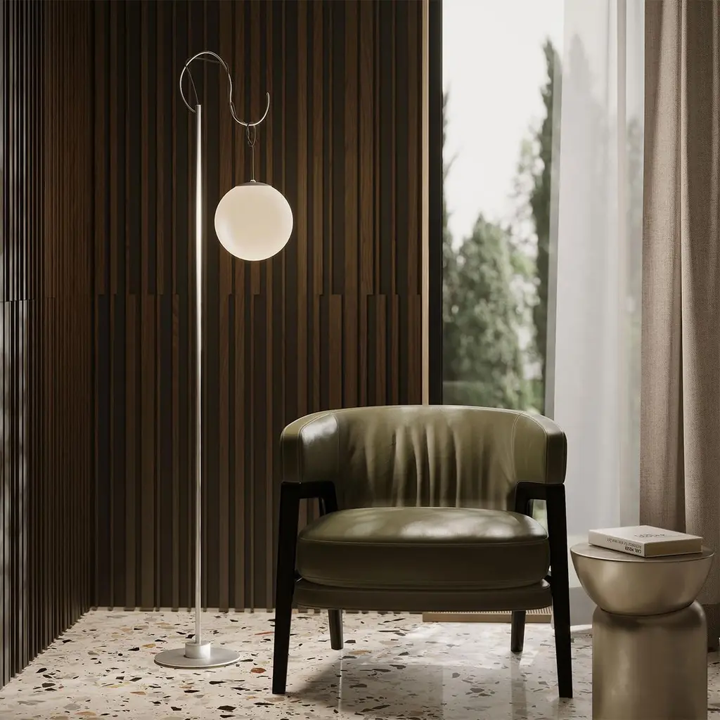 A captivating design that embodies the fusion of solidity and lightness. From the slender silver stem emerges a wire, artfully integrated into the design, that suspends the matte glass sphere, emitting an inebriating glow. A celebration of the synthesis of craftsmanship and engineering, this piece will be the focal point of any home decor, whether showcased in a living room, lounge, or private study.