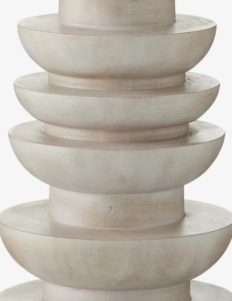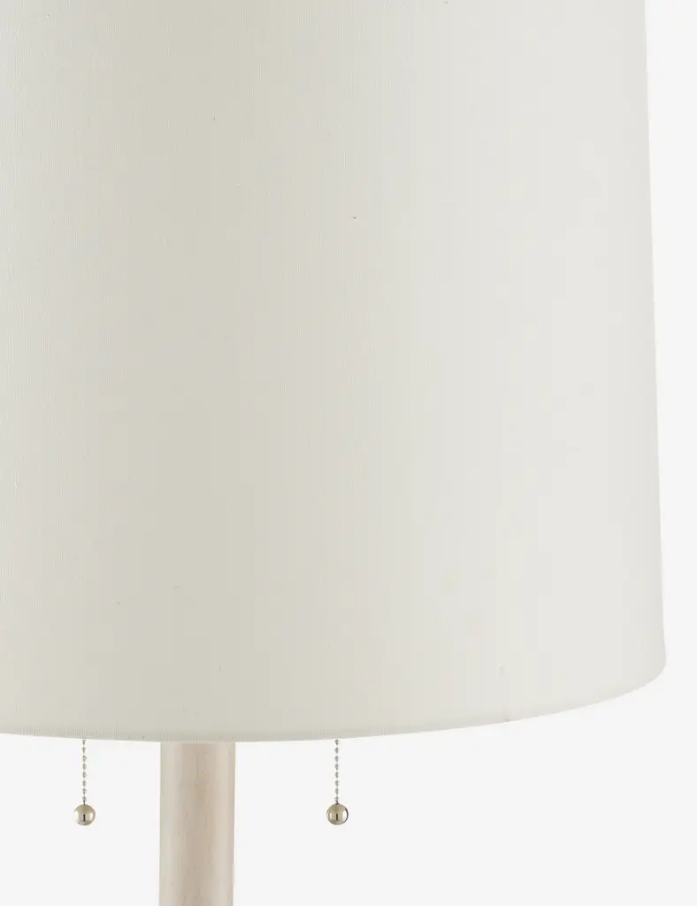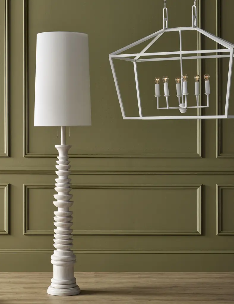 Add a touch of drama to the room with this sculptural floor lamp. The intricate form catches the eye with its tapered column decked in woodwork details. This lamp adds visual interest to the room while offering a grounding touch with its sturdy, rhythmic design and tall linen shade.