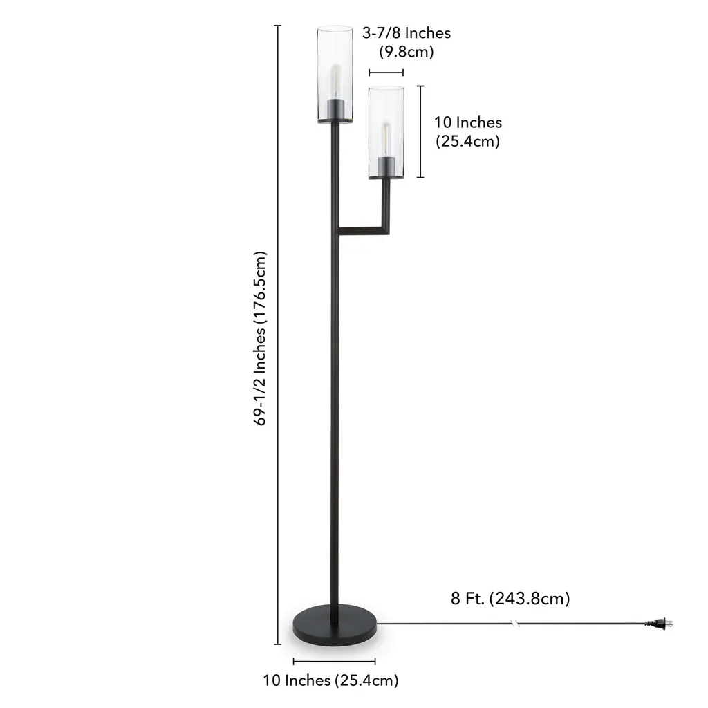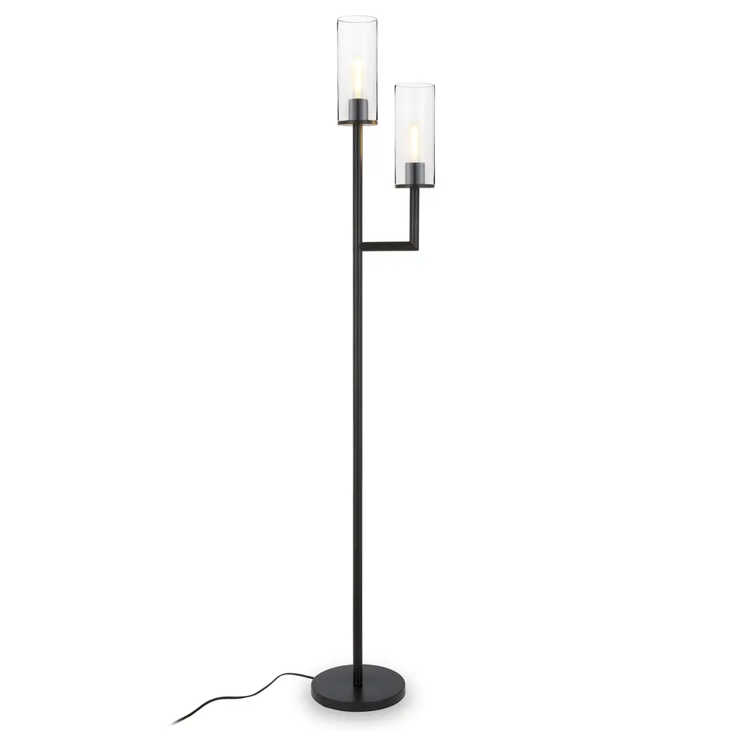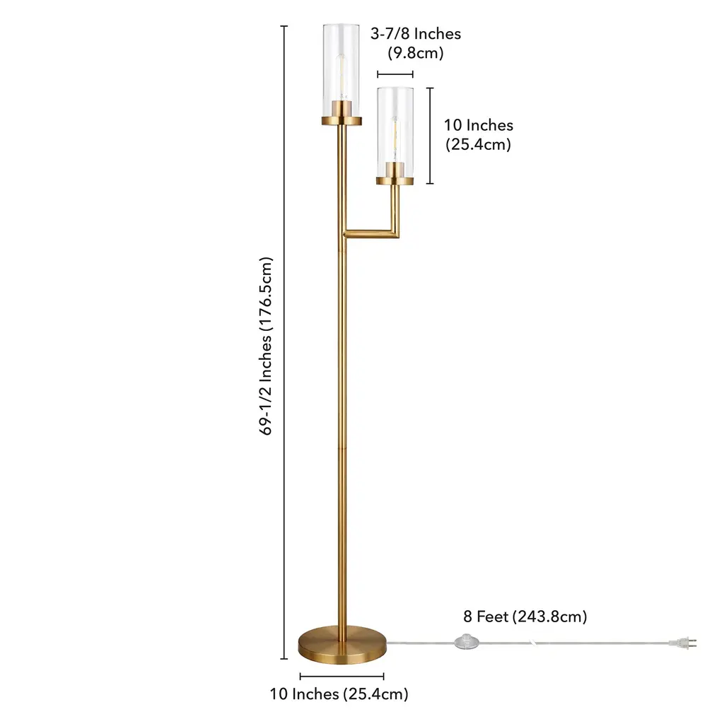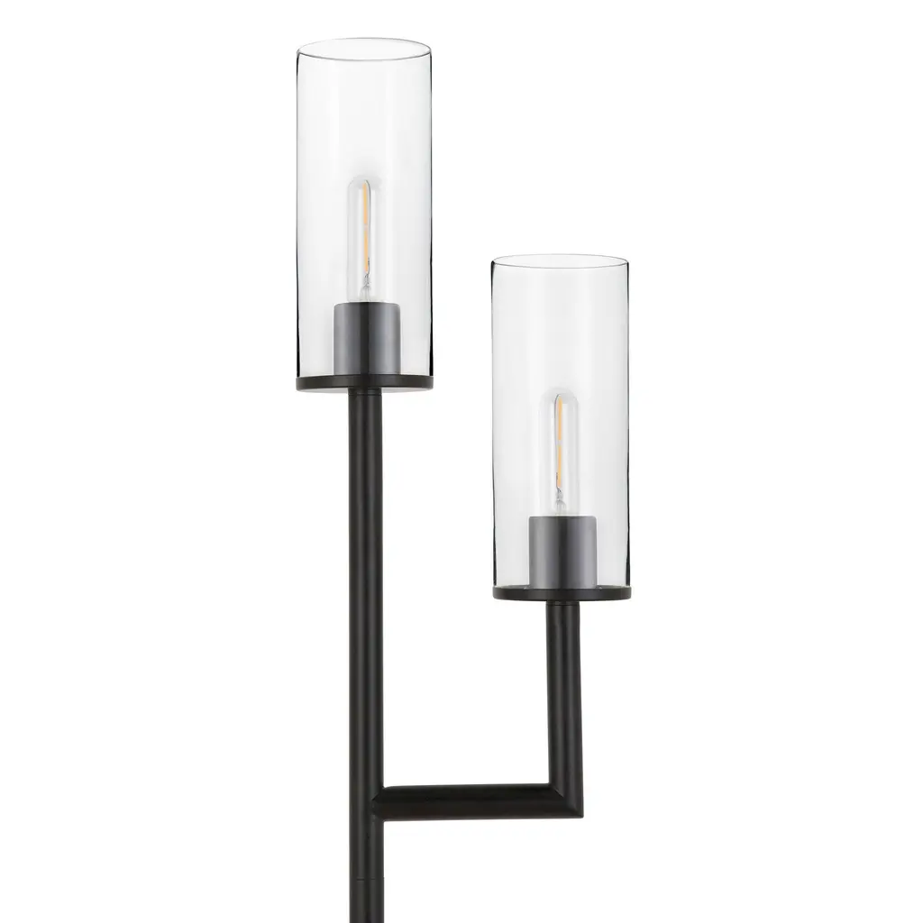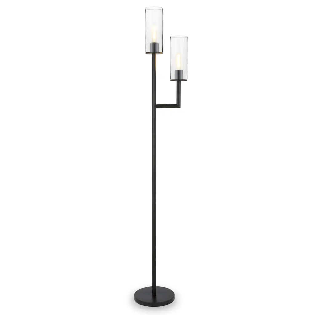 Two lights encased in elegant handcrafted clear glass makes for a brilliant element in this double torchiere lamp. A sleek minimalist industrial style meets mid-century modern glamour in the alluring and distinctive frame. A perfect choice next to your favorite reading chair or sofa, this floor lamp will easily become the focal point in any room.Features: