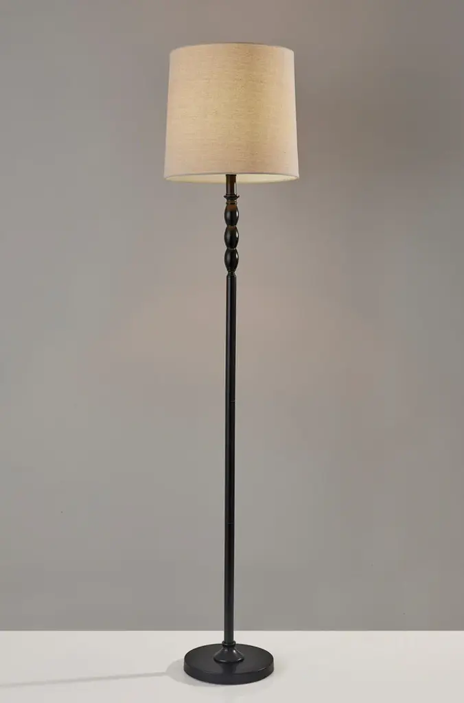 Inspired by traditional woodworking techniques, this floor lamp in uniquely redesigned in cast metal. Fusing modern and rustic influences, the twisting column rises upwards like a vine and makes for a striking sculpture in any room.•Cast Metal Base•100% Linen White Cone Shade with Top and Bottom Trim•Hand-finished in black•Lamp Dimensions: 52"H x 12" diam. Footprint•Shade Dimensions: 13"H x 15" Top Dia. x 18" Bottom Dia.•1 bulb required; Bulb Not Included•150 Max Wattage; 120 Volts•E26 Bulb Base Type •8 Ft Clear Cord•3-way SwitchCare Instructions: We do not recommend using harsh or abrasive cleaners at any time as they can damage product. Wipe surfaces gently with soft, dry cloth. If needed, you may use a lightly damp cloth with water only on base.