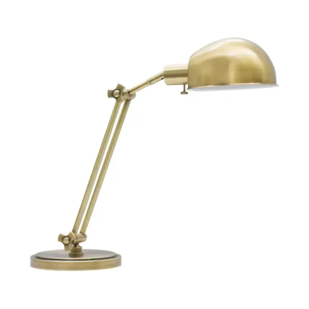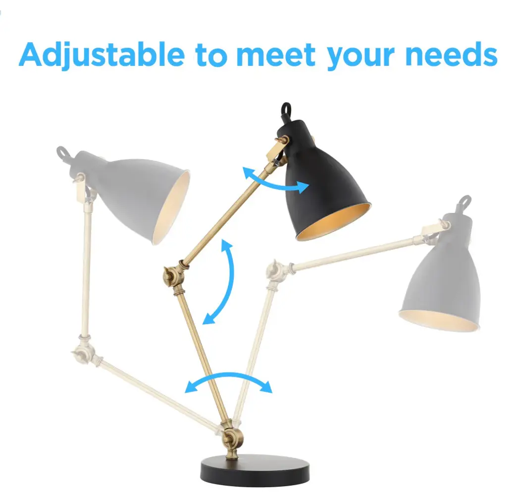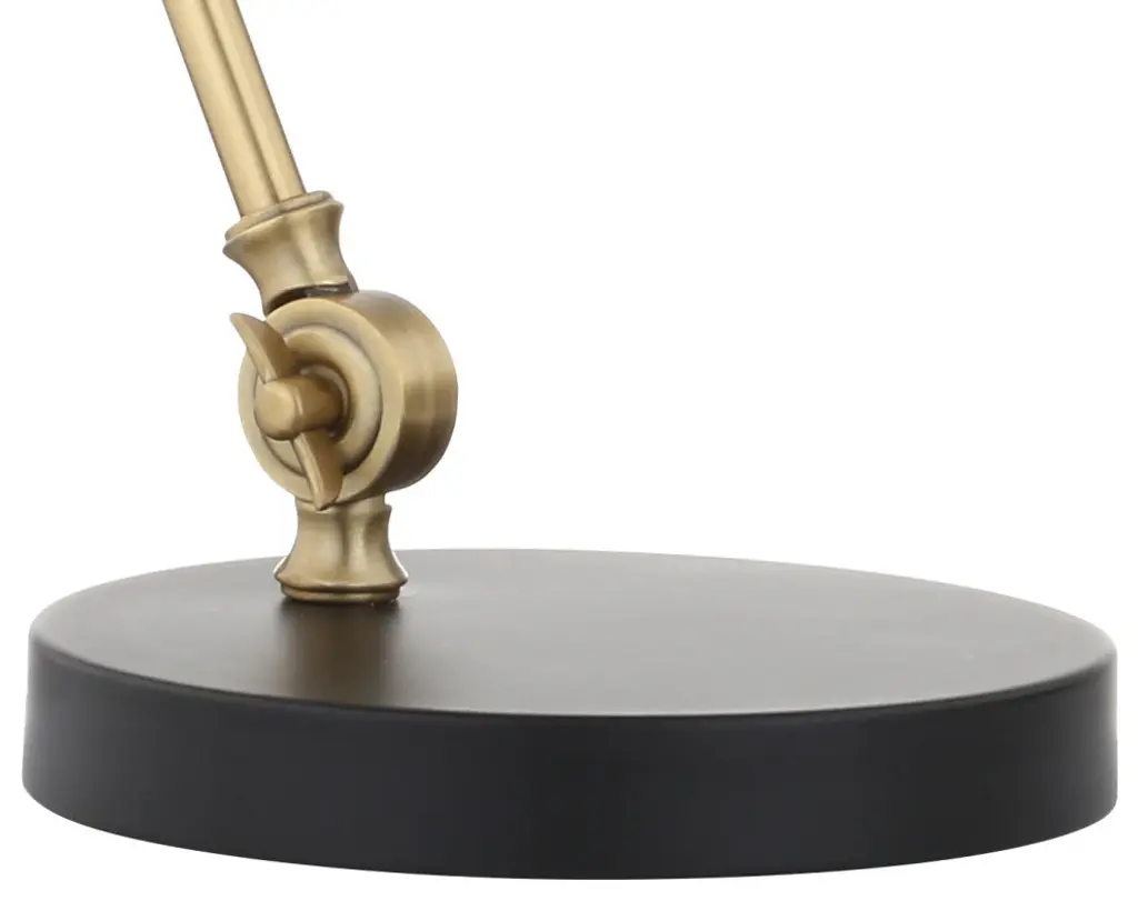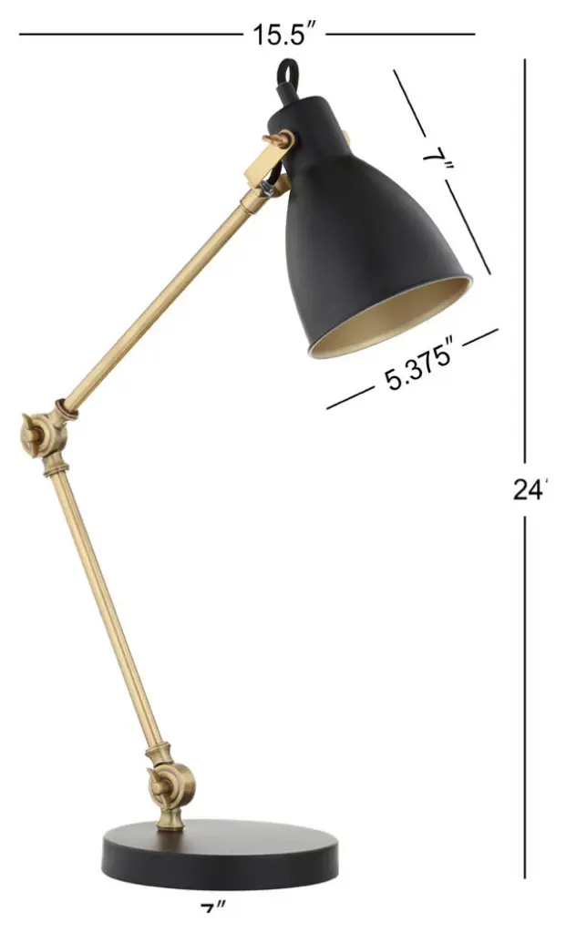 Sleek style and a slender profile add allure to the design of this desk lamp in black and gold. A fresh, polished color combination transforms a classic silhouette into something enticing, combining an iconic shape with luxe finishing touches including brass plating, LED compatibility, and a silk-wrapped cord. This black and antique brass metal desk lamp is right at home in an upscale business or residential work space.-Brass-armed task light brings modern style to any desk -Shade is powder-coated metal lined with brass to reflect maximum light-Beautiful to display or easy to conceal: the 60" cord is silk-wrapped-On-off rotary switch on socket-Takes one maximum 60 watt or equivalent bulb (one LED bulb included)-Eco-friendly 9W LED bulb included-UL Listed-Color: Black / Brass Gold-Body Material: Metal-Base Material: Iron-Finial Material: N/A-Finial Color: N/A-Harp Color: N/A-Includes: 1 lamp(s)-Minor Assembly Required-Lamp: 24 inches high x 15.5 inches wide x 7 inches deep-Shade: 7 inches high x 5.37 inches wide x 5.37 inches deepYou see a lamp.We see a decorative work of art.A perfectly curved shade casts a dramatic shadow on a floor. A silk cord you never want to hide. LED lightbulbs: as easy on the environment as they are on the eyes. The JONATHAN Y Lighting collection considers every detail from impeccably sourced materials to designer styling. And our prices are so attractive, we''ve transformed a functional necessity into a fashion accessory.JONATHAN Y Lighting - a fashion revolution in home decor.