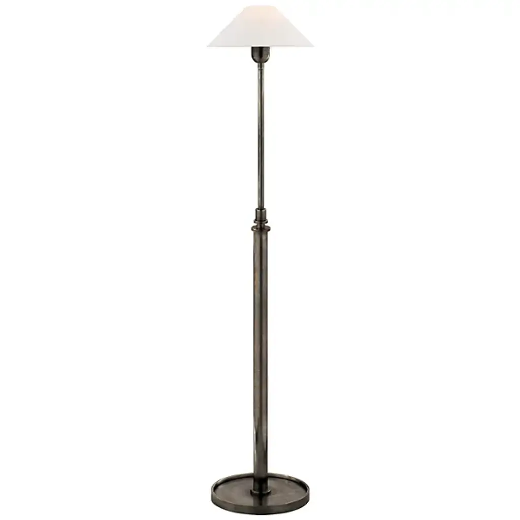 The Basden Adjustable Floor Lamp from Visual Comfort Signature is designed by Chapman & Myers. This adjustable light fixture is crafted from high-quality metal. It is built to last and adds a touch of contemporary elegance to your space. The conical shade, made from linen, casts a soft and inviting glow, creating the right ambiance for relaxation. Dimmable with a separately sold ELV dimmer, you can easily change the brightness level.