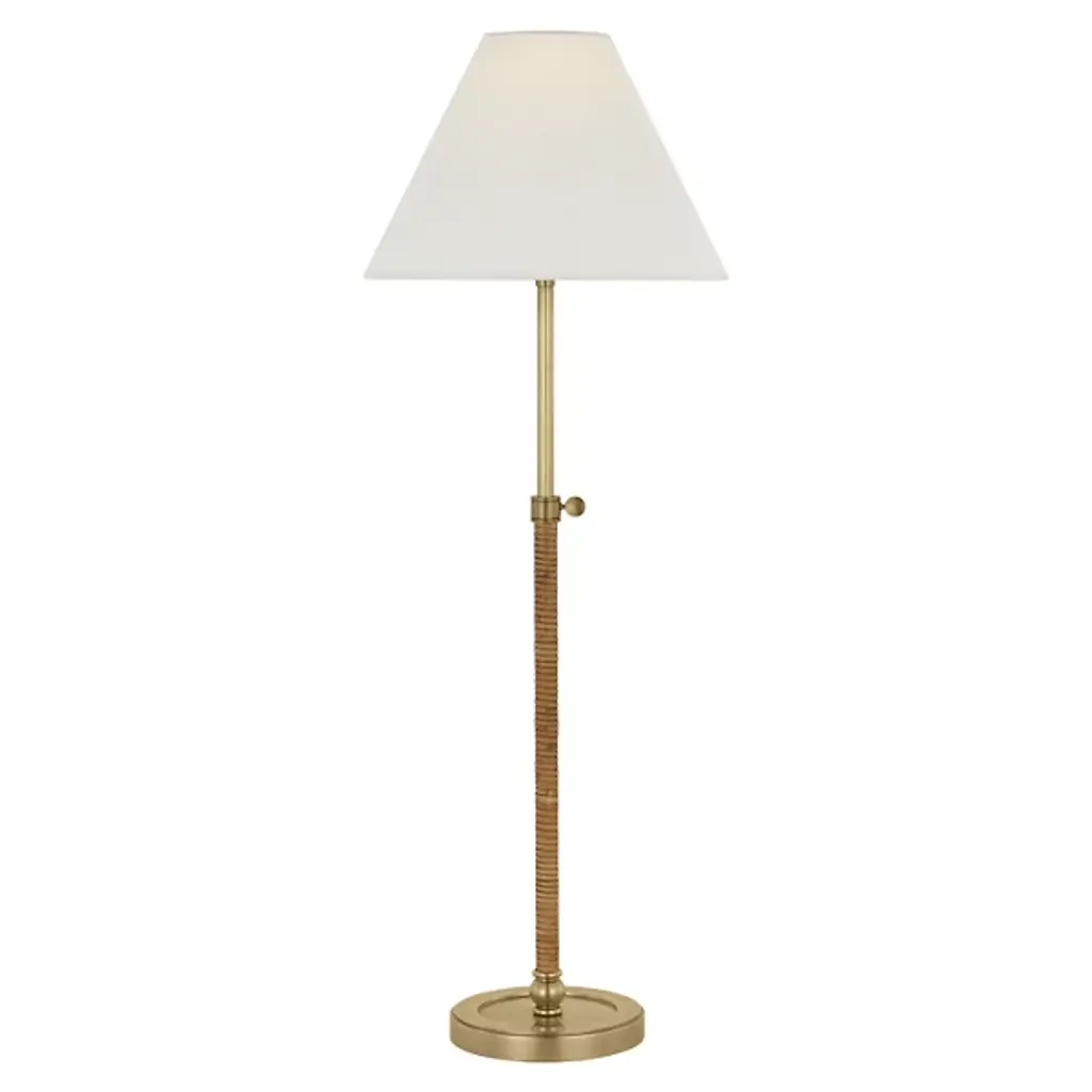 The Basden Adjustable Floor Lamp from Visual Comfort Signature is designed by Chapman & Myers. This adjustable light fixture is crafted from high-quality metal. It is built to last and adds a touch of contemporary elegance to your space. The conical shade, made from linen, casts a soft and inviting glow, creating the right ambiance for relaxation. Dimmable with a separately sold ELV dimmer, you can easily change the brightness level.