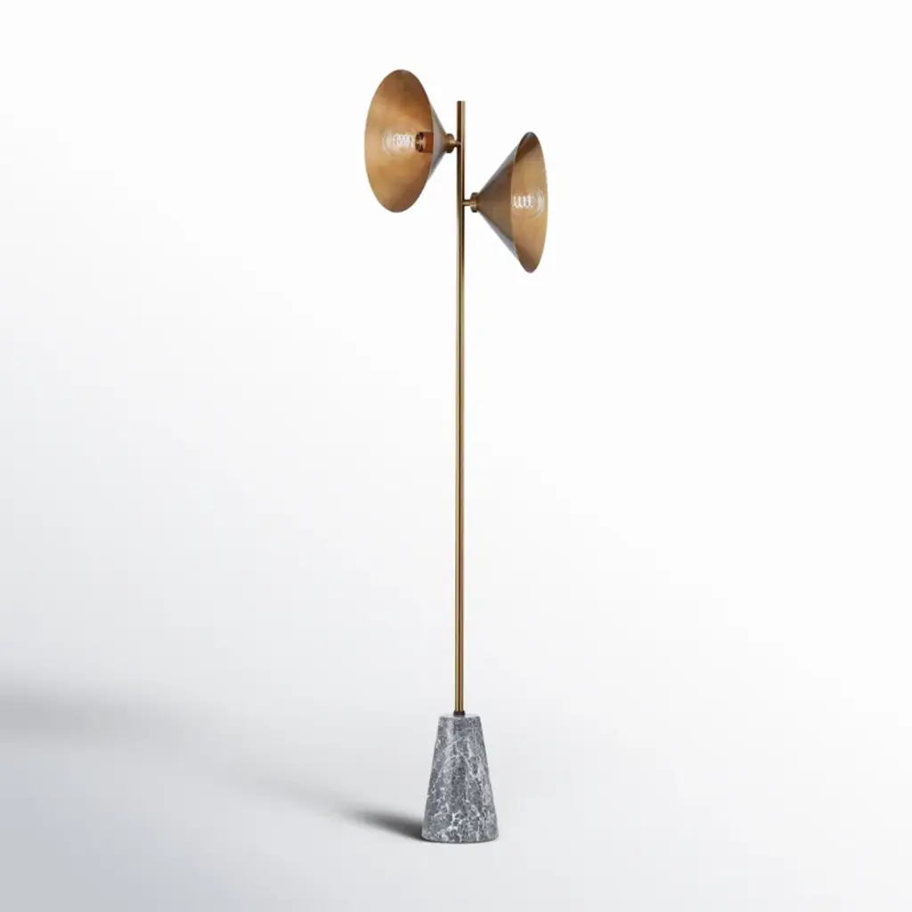 The Bash Floor Lamp by Troy Lighting draws inspiration from mid-century design, its steel structure finished in warm Patina Brass. A chic touch is added to the fixture with its Honed Grey Emperador Marble base in a conical arrangement drawing the eye. Wherever it is placed, Bash casts a wide spectrum of illumination, making an immediate impression. Crafted from steel with dish-style shades, this lamp seamlessly blends elements of Industrial and Mid-Century Modern styles, ensuring it stands out as a versatile addition to contemporary interiors.