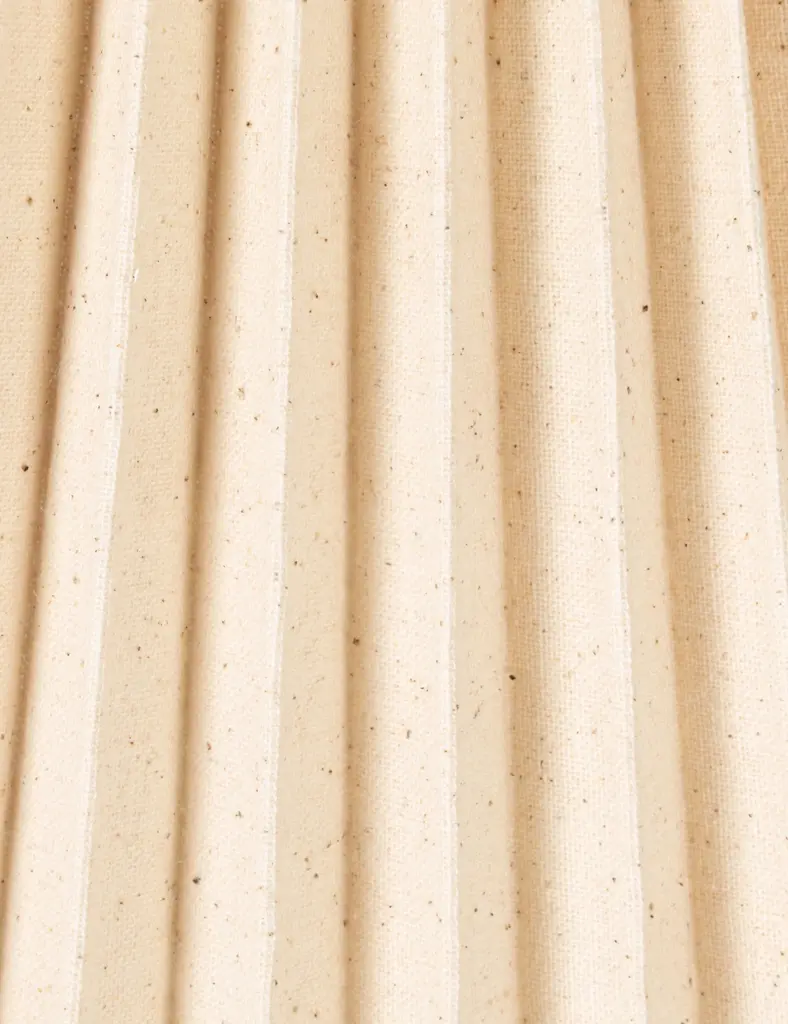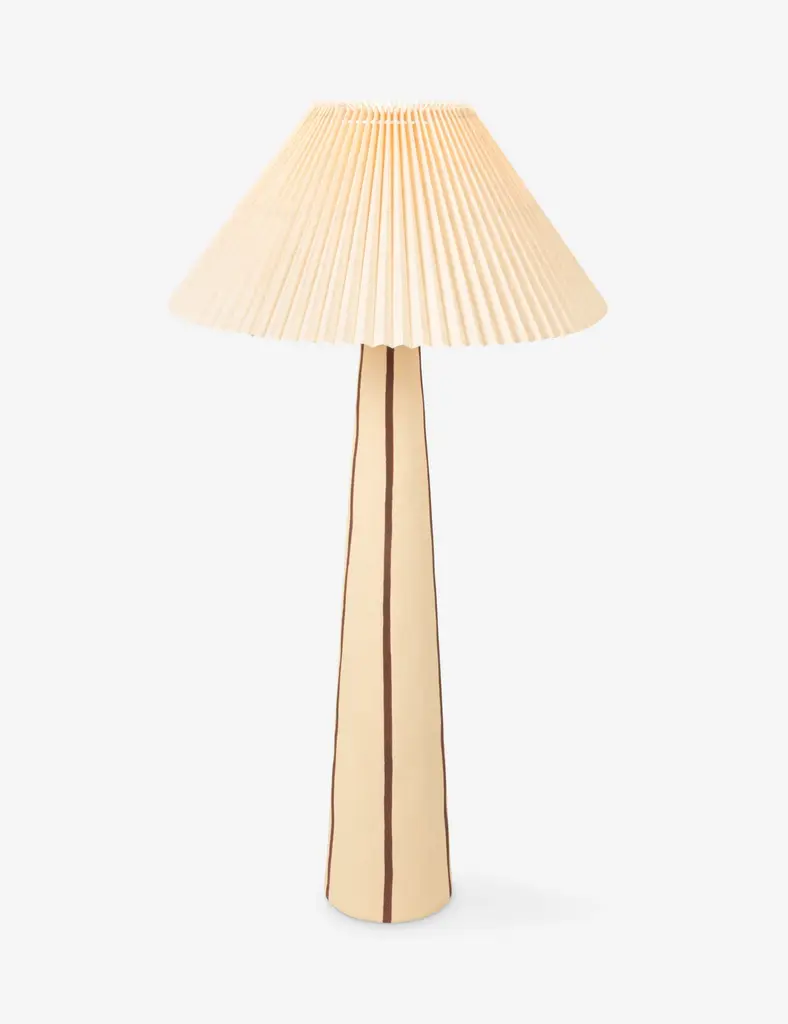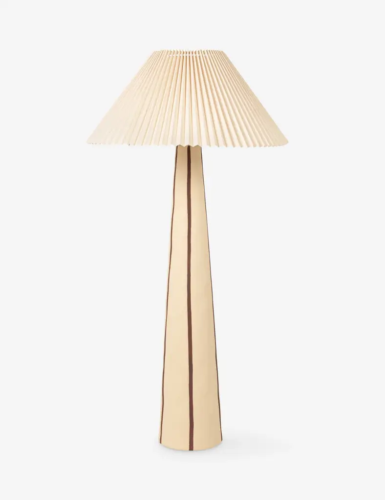 The Baza lamp pairs hand-painted stripes with a pleated shade, offering a warm mix of artistry and refinement. Its tall, tapered base brings bold scale to the design, making this floor lamp a striking statement for living rooms or entryways.
