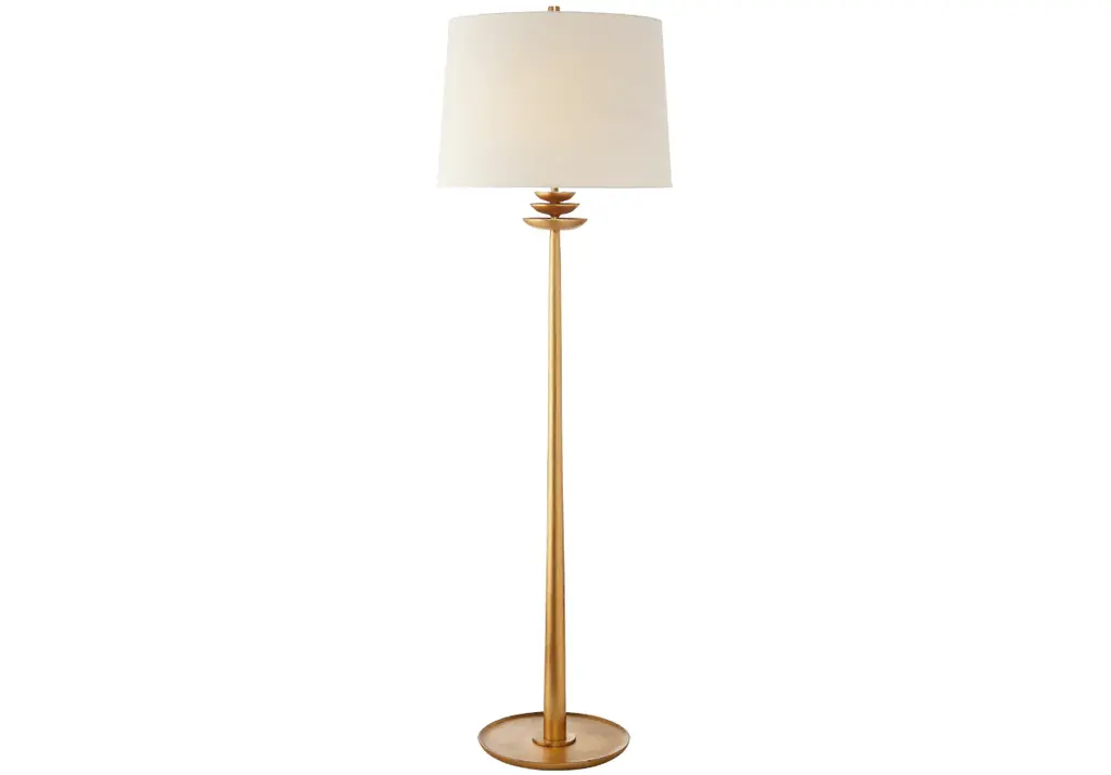 A beautiful addition, the Beaumont Floor Lamp features a tall, thin stem complemented by petal-like accents and a wide linen shade. Its effortlessly style lends elegance, styling well into libraries and living rooms.