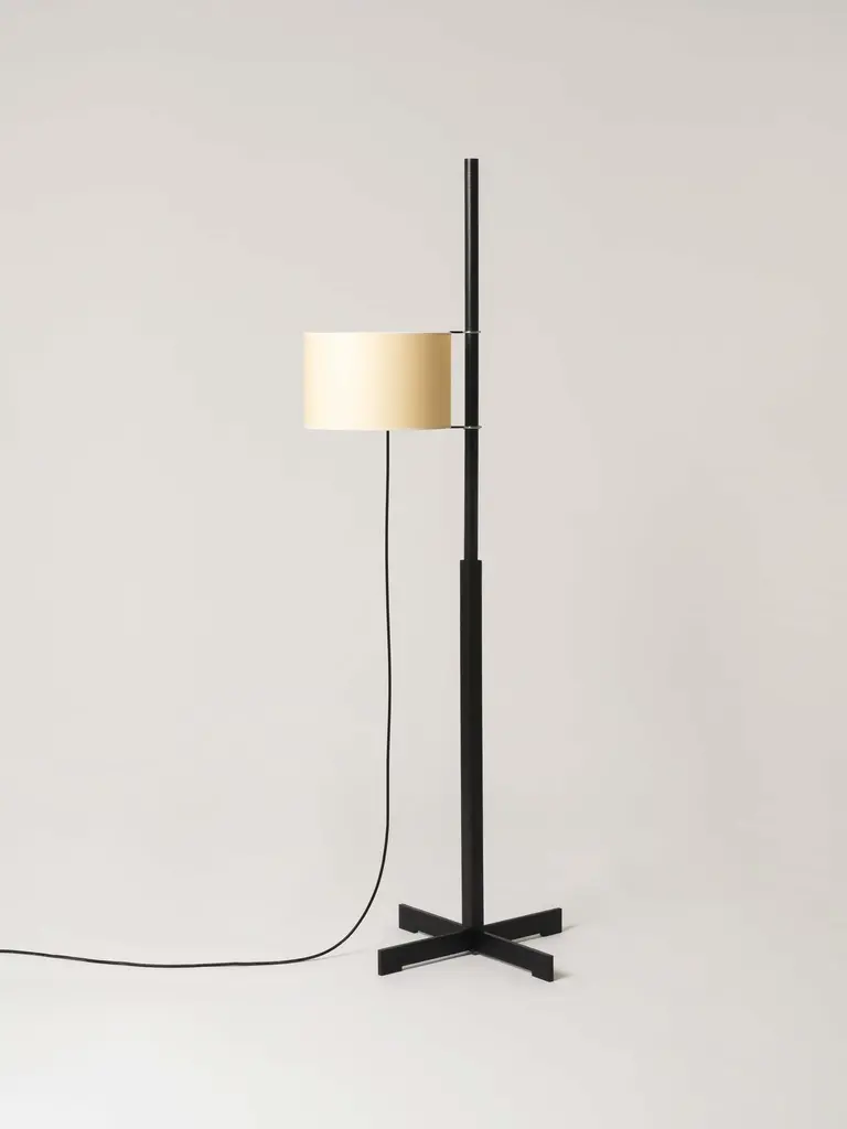 Beige and black oak TMM floor lamp by Miguel Milá.Dimensions: D 50 x W 60 x H 166 cm.Materials: Cherry wood, parchment lampshade.Available in 3 lampshades: beige, white and white with diffuser.Available in 5 woods: beech, cherry, walnut, natural oak and black oak.In a flourish of formal serenity and functional efficacy, Miguel Milá cleverly separated the three basic components of any lamp: the structure, the electrical parts and the shade. The light source rotates around the shaft and can be raised or lowered like a flag on a mast.Height-adjustable lampshade. The light is switched on/off by pulling softly from the cable.Santa & Cole is a small, independent and global editor of design products, with its roots in Belloch (Barcelona, Spain). We have been editing since 1985, when the company was first founded. By editing we mean preparing a work for the public domain, we mean adapting an item for everyone’s use. What a book editor does with stories, we do with objects.More than eighty creators have contributed to a rich catalogue of furniture and lighting products originating in very different contexts, by renowned designers such as Antoni Arola, Miguel Milá, André Ricard and llmari Tapiovaara.Acute and attentive to quality and detail, Santa & Cole outsources all of its industrial production to an extensive network of suppliers, mainly in Spain, but also in other countries such as Japan, where the washi paper for our Tekiò lamp is made.Our mission is to build, safeguard and disseminate knowledge through design objects. Objects whose quality is recognisable at the touch of a hand, and that enrich people’s lives, whether at home or in shared environments. Our philosophy is more modern than futurist and we are more intrigued by silence than by stridency.Our focus is not the present market, but the future one; not Barcelona, but the world; not fashion, but history.All our lamps can be wired according to each country. If sold to the USA it will be wired for the USA for instance.