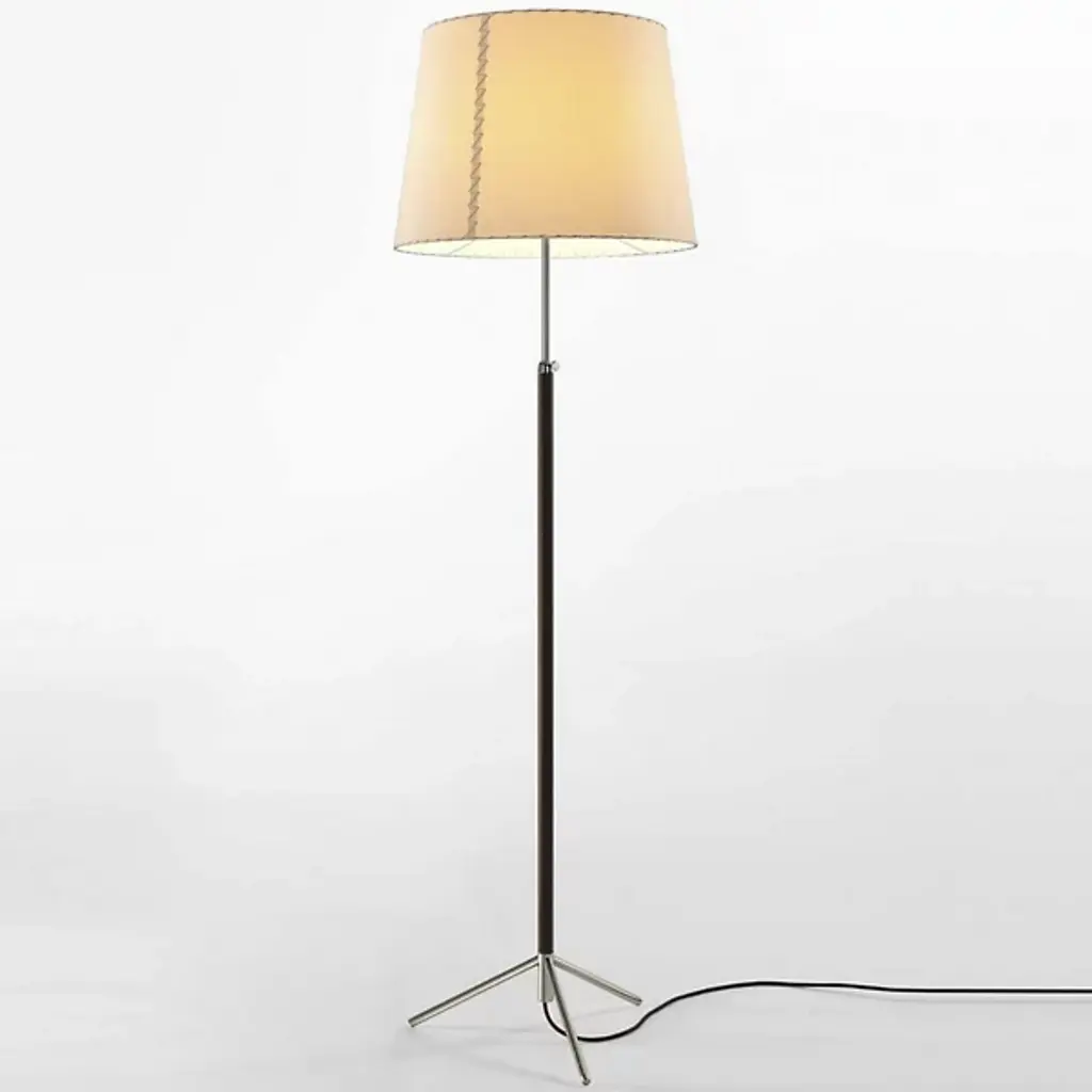 Beige and Chrome Pie de Salón G1 floor lamp by Jaume SansDimensions: D 45 x H 120-160 cmMaterials: Metal, leather, stitched parchmentAvailable in chrome-plated or polished brass structure.Available in other shade colors and sizes.This slender synthesis of traditional lamps is a sparkle of timeless elegance created in a context of the avant-garde. The combination of materials with its symmetrical, leather-wrapped centre shaft, its choice of three shade materials and eight colour options make it a paradigm of industrial craftsmanship.Height adjustable lampshade.Dimmer included.Santa & Cole is a small, independent and global editor of design products, with its roots in Belloch (Barcelona, Spain). We have been editing since 1985, when the company was first founded. By editing we mean preparing a work for the public domain, we mean adapting an item for everyone’s use. What a book editor does with stories, we do with objects.More than eighty creators have contributed to a rich catalogue of furniture and lighting products originating in very different contexts, by renowned designers such as Antoni Arola, Miguel Milá, André Ricard and llmari Tapiovaara.Acute and attentive to quality and detail, Santa & Cole outsources all of its industrial production to an extensive network of suppliers, mainly in Spain, but also in other countries such as Japan, where the washi paper for our Tekiò lamp is made.Our mission is to build, safeguard and disseminate knowledge through design objects. Objects whose quality is recognisable at the touch of a hand, and that enrich people’s lives, whether at home or in shared environments. Our philosophy is more modern than futurist and we are more intrigued by silence than by stridency.Our focus is not the present market, but the future one; not Barcelona, but the world; not fashion, but history.All our lamps can be wired according to each country. If sold to the USA it will be wired for the USA for instance.