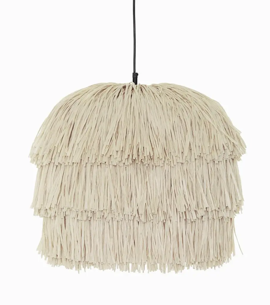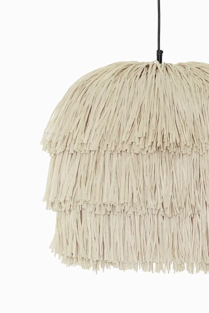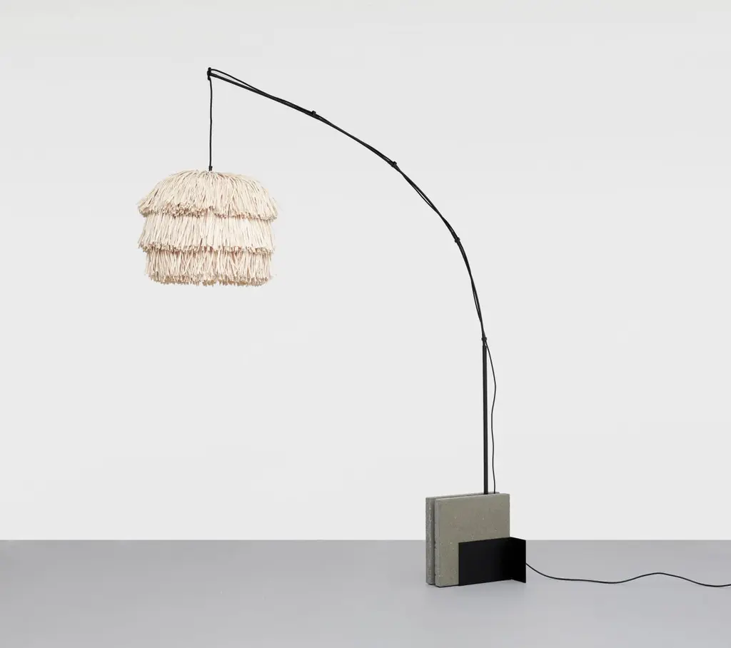 Beige Fran L stand floor lamp by Llot LlovHandcrafted light objectDimensions: D 50 x W 205.8 x H 250 cmMaterials: raffia fringes, glass fiber, steel, concreteColour: beigeAlso available in green, coral, black.Another member of the FRAN family is the floor lamp FRAN STAND. The pole that supports the FRANs lamp body is made of glass fiber and is plugged together according to the tent pole principle. It is thus flexible so that the lamp begins to swing in the wind or when touched. The base that holds the lamp is made of powder-coated steel. For the necessary weight, but also for the individual style, the base consists of two compartments into which classic concrete floor plates are embedded for weighting. But any other stone slab in a suitable format can also be used for weighting and design.With their bulky silhouette and rustling fringes, the FRAN lights are reminiscent of a piñata. While their cable becomes the suspension string, their fluttering body is made of high-quality rayon, a viscose fibre based on cellulose. The fringe strands are fitted in layers and create a subtle bob or a bulky statement piece – depending on the amount of material. FRAN is available in four bold block colours (beige, red, green and black), which work on their own as in monochrome or contrasting combinations as well. Despite their volumes, the shades can be folded flat for shipment.Behind the LLOT LLOV brand is the studio for product and interior design as well as the producer of furniture, objects, lighting and surfaces. Since their foundation in 2006 by Ania Bauer and Jacob Brinck, the two Berlin based author designers have established themselves internationally. One of their recognizable features is the reinterpretation of traditional arts and crafts brought into a contemporary design context.An example of this is OSIS, an innovative surface finish using salt crystals and colour pigments on wood, with which they won the German Materials Prize, among other awards. They use OSIS as well as the terrazzo GLACIER, which was introduced in 2018 and is made of nail polish bottles, for their own designs, but they also supply interior designers worldwide. For GLACIER, as for other designs, they upcycle high-quality materials, for example from the cosmetics industry. Their objects are manufactured in Europe, often in social workshops, and distributed directly by LLOT LLOV.LLOT LLOV produce exclusive furniture and objects for private or corporate clients and also manage interior design projects such as hotels or offices. In addition, the duo has been running a shop for fashion and accessories in Berlin-Mitte with BAERCK since 2007.