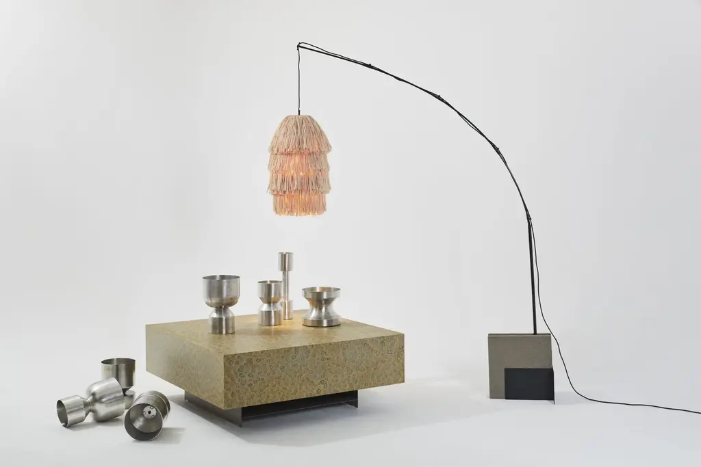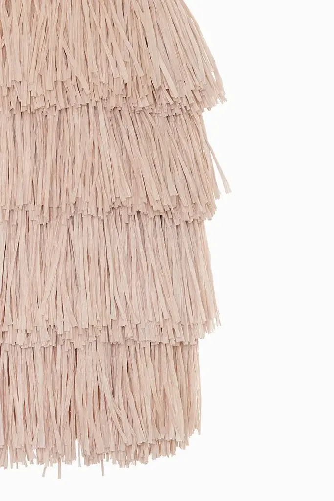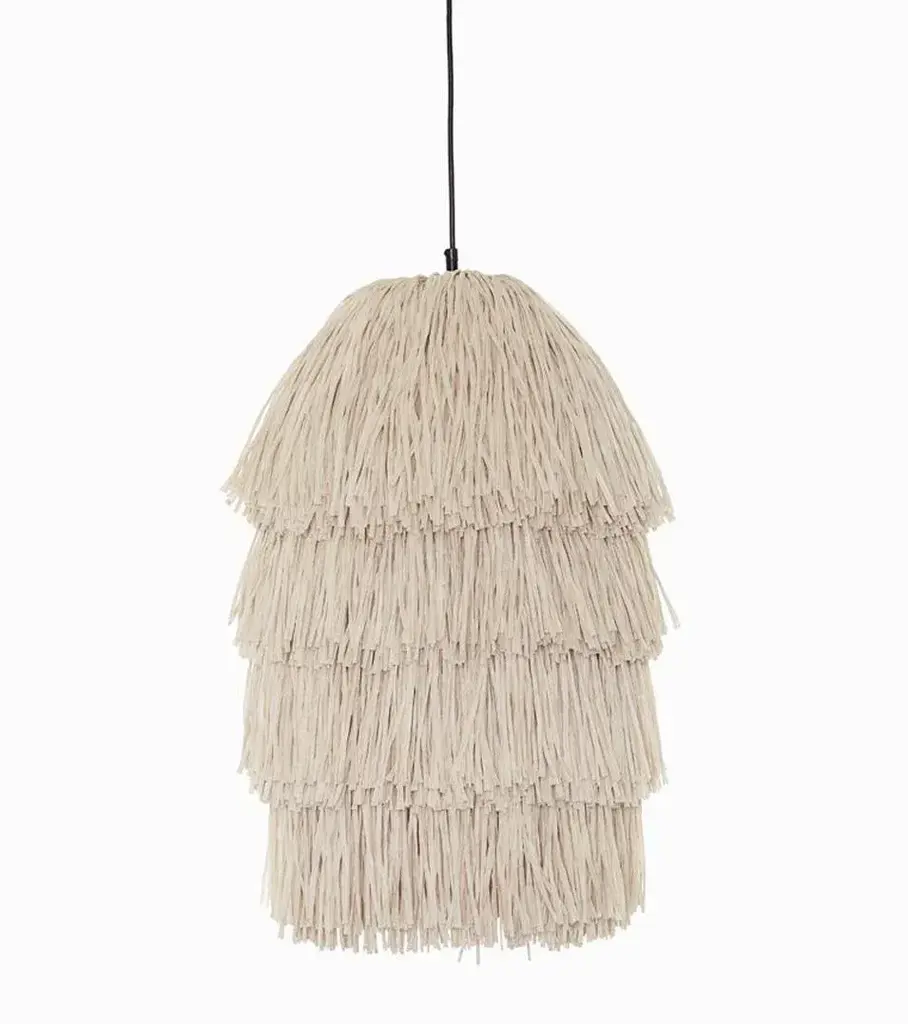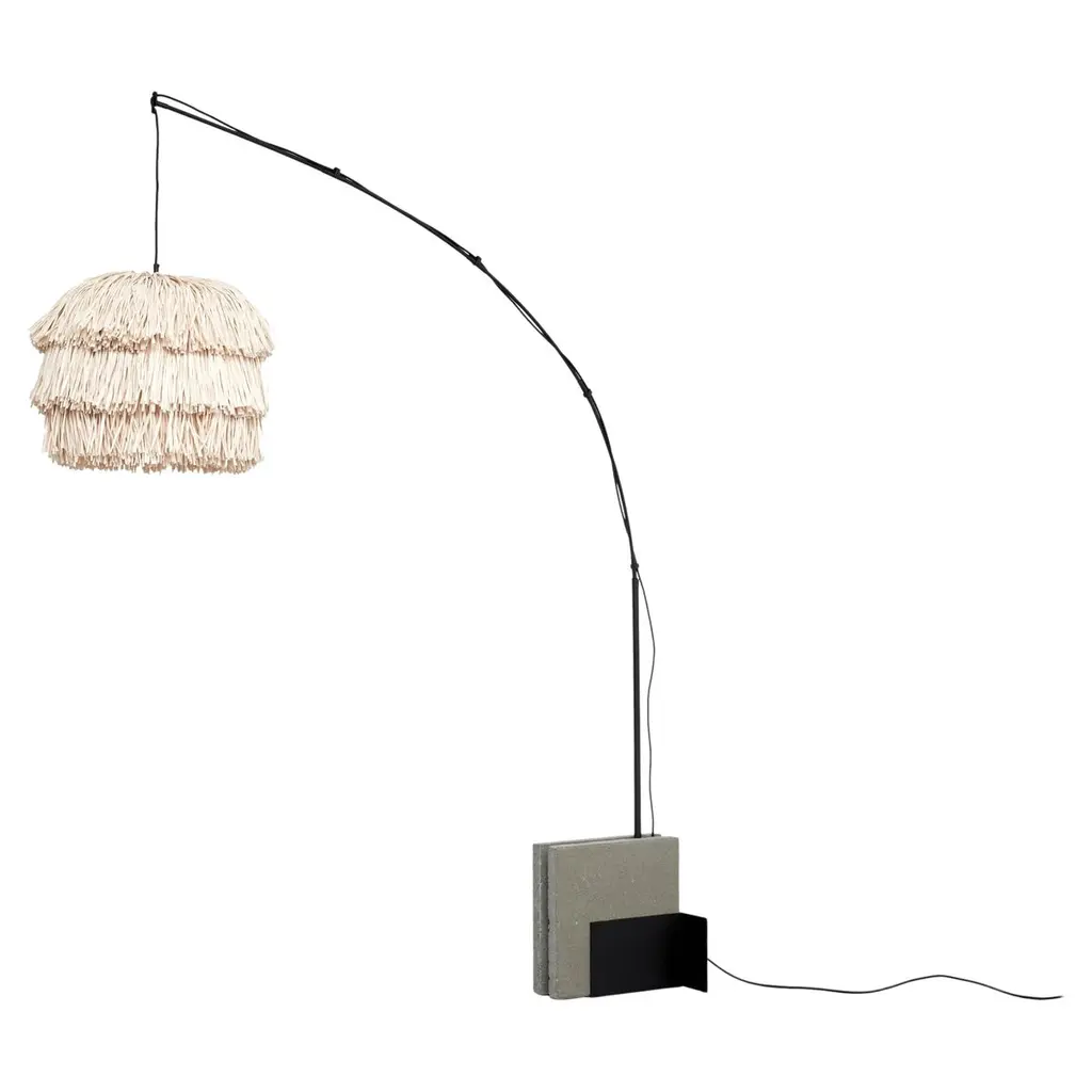 Beige fran m stand floor lamp by llot llov handcrafted light object dimensions: d 45 x w 205.8 x h 250 cm materials: raffia fringes, glass fiber, steel, concrete colour: beige also available in green, coral, black. Another member of the fran family is the floor lamp fran stand. The pole that supports the frans lamp body is made of glass fiber and is plugged together according to the tent pole principle. It is thus flexible so that the lamp begins to swing in the wind or when touched. The base that holds the lamp is made of powder-coated steel. For the necessary weight, but also for the individual style, the base consists of two compartments into which classic concrete floor plates are embedded for weighting. But any other stone slab in a suitable format can also be used for weighting and design. With their bulky silhouette and rustling fringes, the fran lights are reminiscent of a piñata. While their cable becomes the suspension string, their fluttering body is made of high-quality rayon, a viscose fibre based on cellulose. The fringe strands are fitted in layers and create a subtle bob or a bulky statement piece – depending on the amount of material. up to 250v (europe/uk standard).