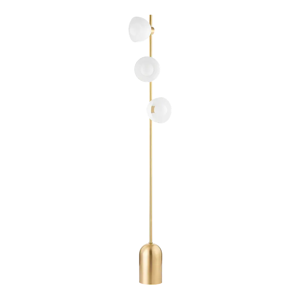 Cool contrast and fine form achieve harmony in the memorable silhouette of the Belle Floor Lamp from Mitzi. The floor lamp’s metal finish pops against the glossy white shades. The shades are arranged dynamically around the piece’s column to give the light a multi-directional quality. These shades feature exposed bulbs for a futuristic effect and a brilliant light. A bullet-shaped column anchors the piece suited for tight or open spaces.