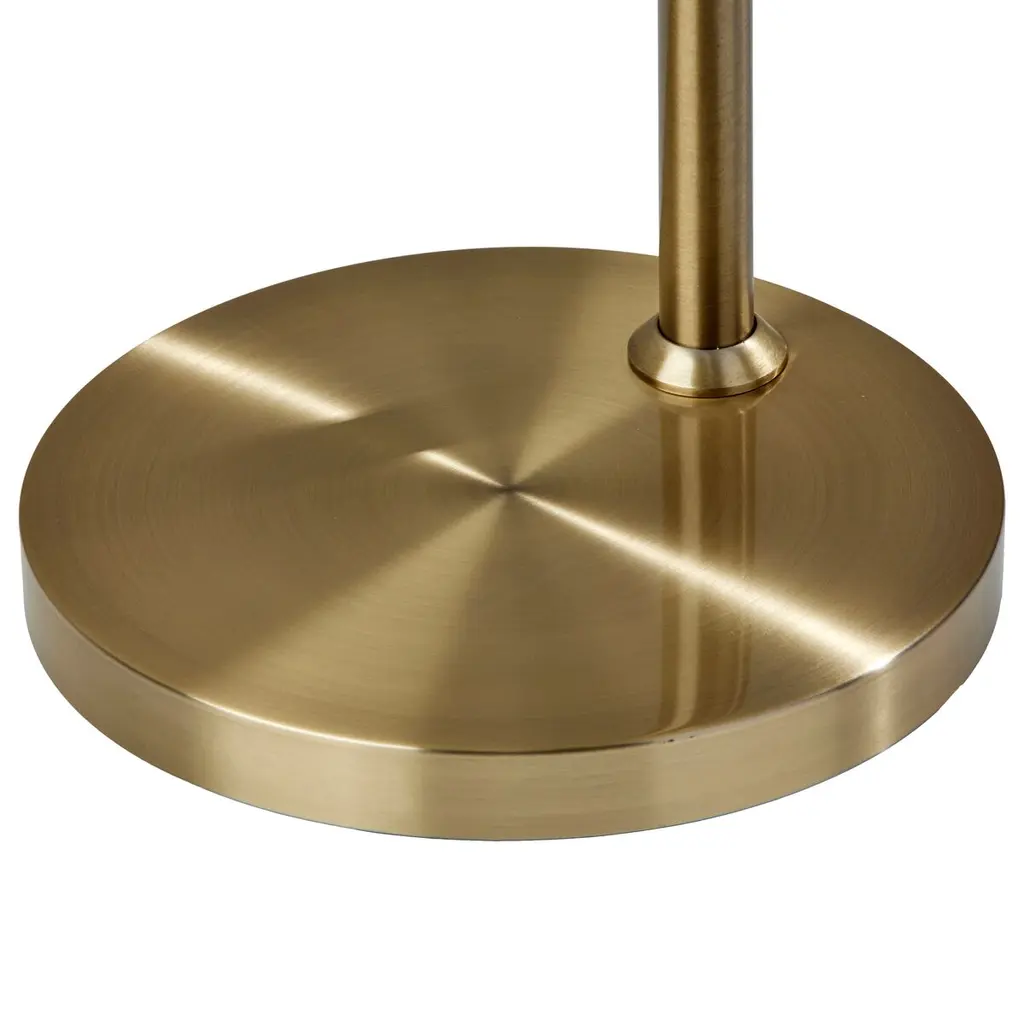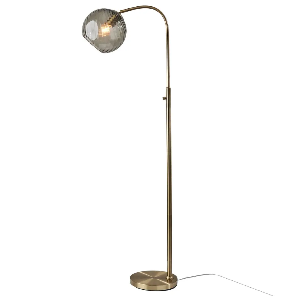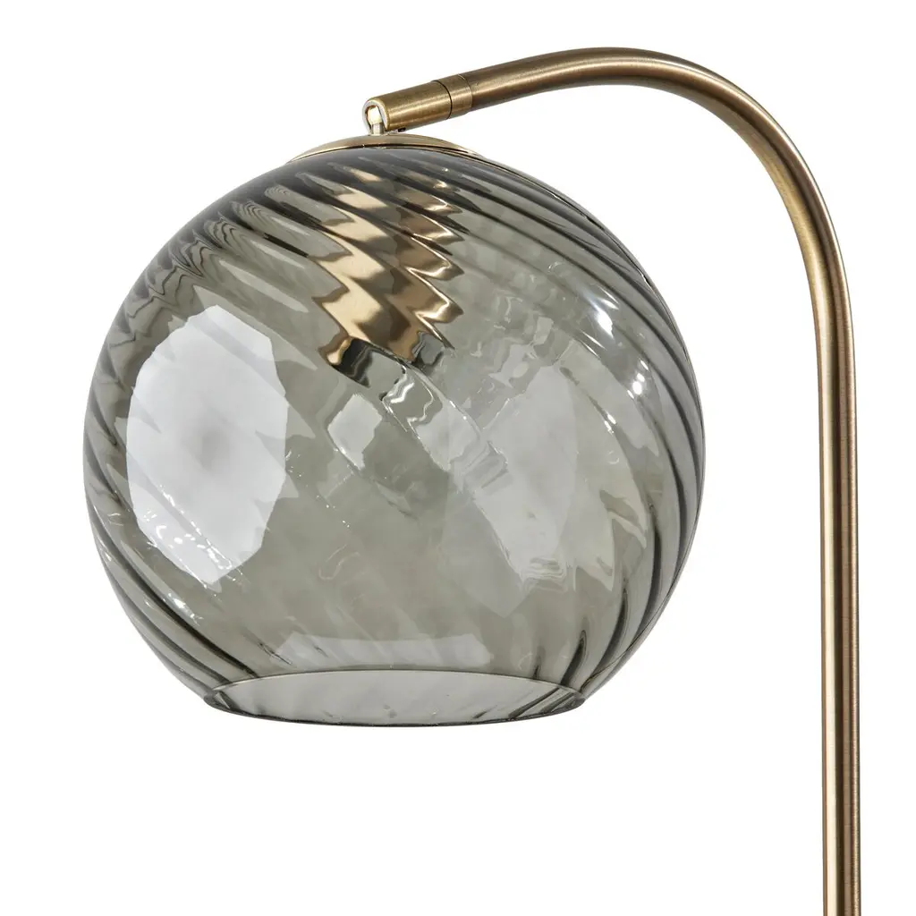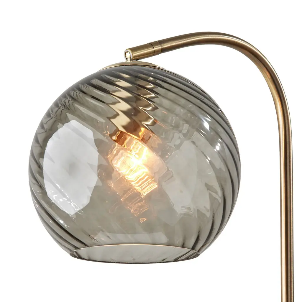With a blend of contemporary and mid-century modern design elements, this floor lamp imbues any space with warmth and light. A round base with an antique brass finish supports a matching tall tube and gently arcing stem. Suspended from the stem is a 9" diameter globe shade crafted of smoked glass with a delicate swirl pattern. The glass leaves the 60W bulb visible, making a vintage Edison bulb (not included) a striking choice. For added versatility, the base of the lamp shade features an articulation point, allowing you to redirect the shade for a variety of looks and lighting options.
