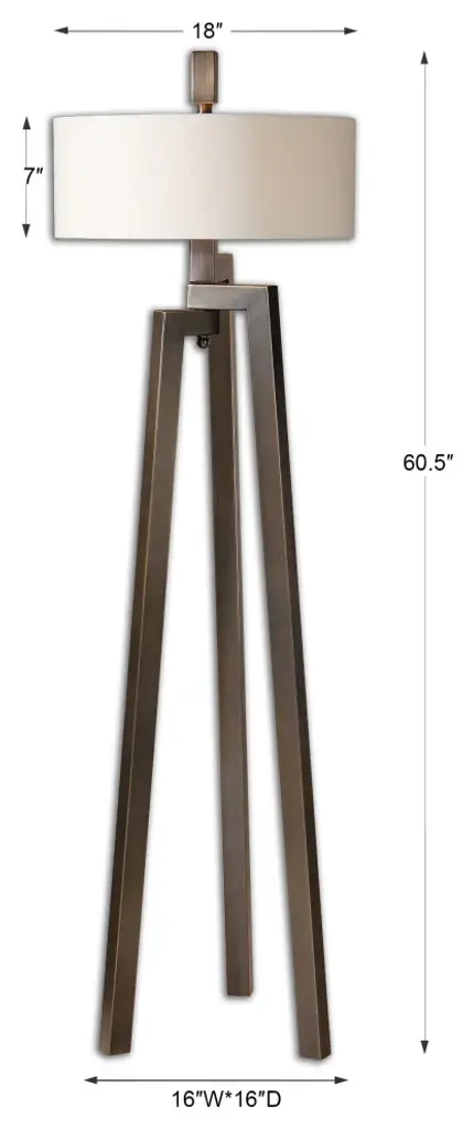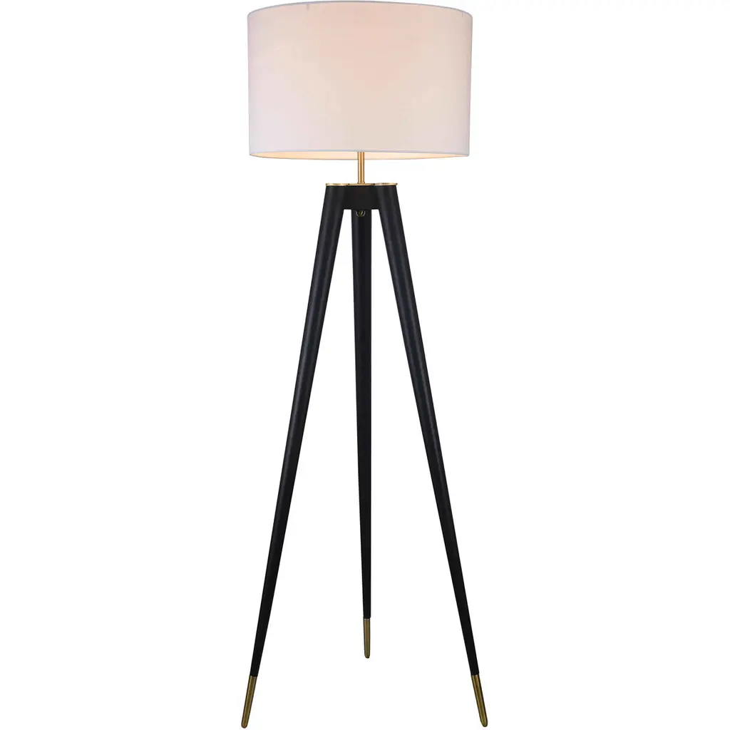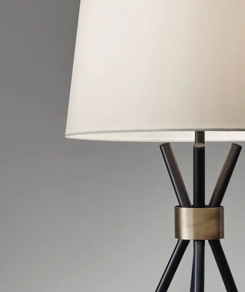 The Benson floor lamp is a black metal tripod gathered at the neck with an antique brass accent and topped with an off-white linen drum shade. There is a three-way rotary switch located under the socket (3-way feature will only work with 3-way light blubs). Otherwise, this lamp will function with simple on/off at its highest setting. This lamp is smart outlet compatible. Bulb is not included.