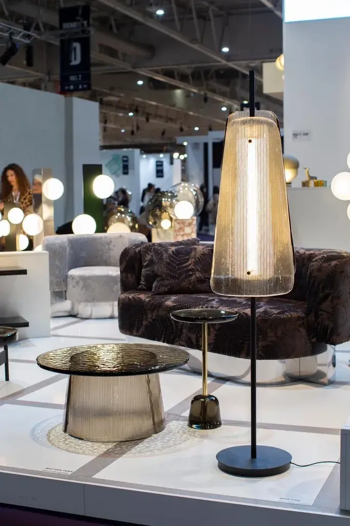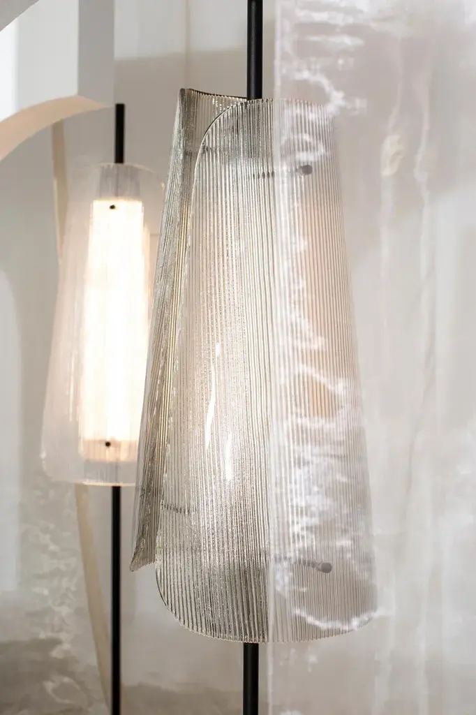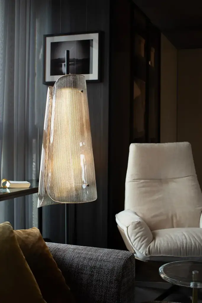 The conical glass sections of Sebastian Herkner's floor lamps bent are a bow to the classic lampshade. The fluted glass is created by pouring liquid glass mass into a mould. Each handcrafted piece is unique with its own character. European Plug (up to 250V).