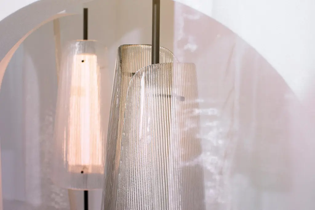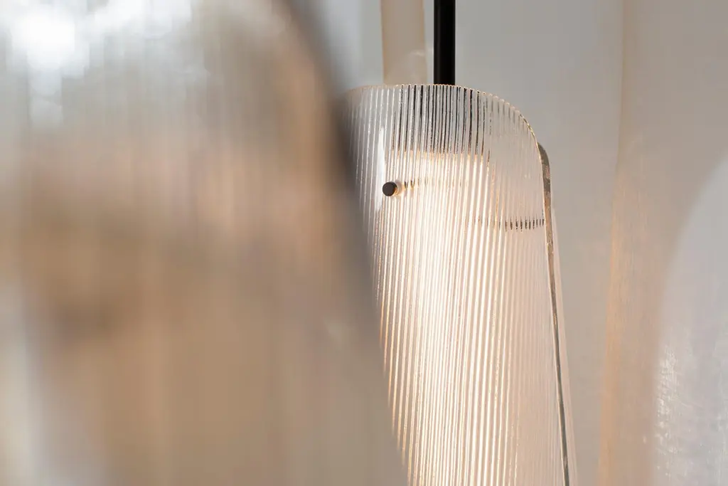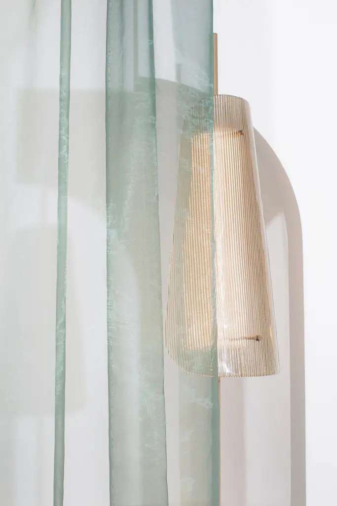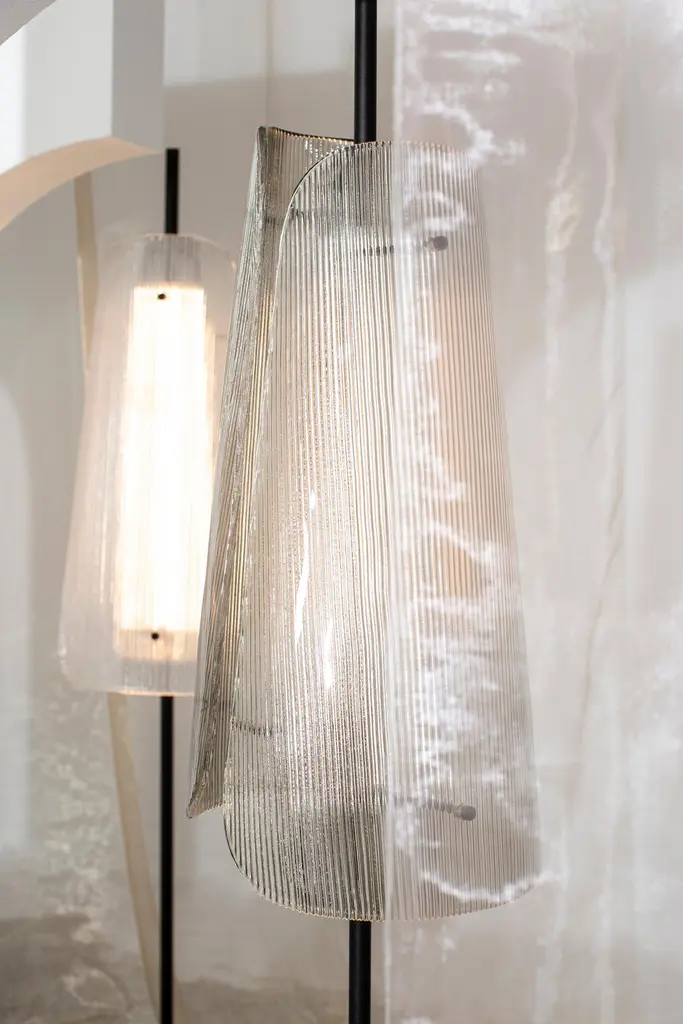 Bent two transparent black floor lamp by PulpoDimensions: D34 x H164 cmMaterials: Steel powder coated, 2 shades, casted glass, textile.Also available in different finishes: Smoky grey black, transparent black, smoky grey champagner, transparent champagner.Presenting the beauty of glass through simple abstract forms, bent is a sculptural piece with a unique presence. A simple black steel frame allows its centrepiece to shine brightest; one or two curved sections of casted and coloured glass. The simple pattern on the glass surfaces extends the light source to present a wave of form and light – illuminating even the darkestinteriors.Each piece is created from casted and coloured glass sheet, slumped into form. Bubbles, streaks and other variations in Size and colour are part of production processes, and not defects in the design or production. The stand and base are produced from powder coated steel.All our lamps can be wired according to each country. If sold to the USA it will be wired for the USA for instance.Pulpo is a design editor for high-end products in the home sector.Design is our passion. Art is our engine. We are fascinated by the Craft of the ceramic and glassblowing workshops and are guided by the rough aesthetics of these unique pieces.Pulpo’s philosophy goes back to the IDEA of ??the “carte blanche”. Our designers and artists develop their designs freely and experimentally. A variety of materials and a weakness for structures are our strengths.The headquarters of pulpo is in Weil am Rhein, near the Swiss border. Consisting of the creative and sales department, warehouse and logistics, this is the think tank for our artists and designers. pulpo’s dealer network extends far beyond Weil am Rhein – from Iceland and Dubai to Australia.Pulpo is movement – is possibility – is passion.In 2006, pulpo was founded by Ursula and Patrick L’hoste as a design brand at the interface between shape and Material. pulpo’s conception is to edit lighting, furniture and accessoires on editor’s choice. The company’s focus is to conduct up-and-coming designers and selected manufacturers, using the nature of Material’s to form the score. Materials such as ceramics, stone and especially glass, which is pulpo’s primary focus since 2013.