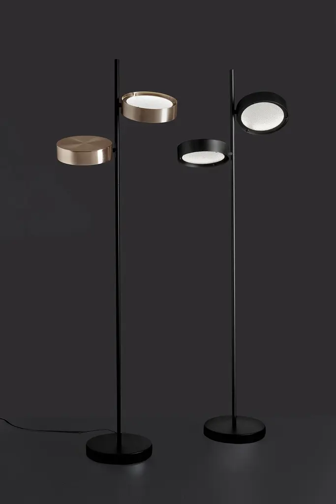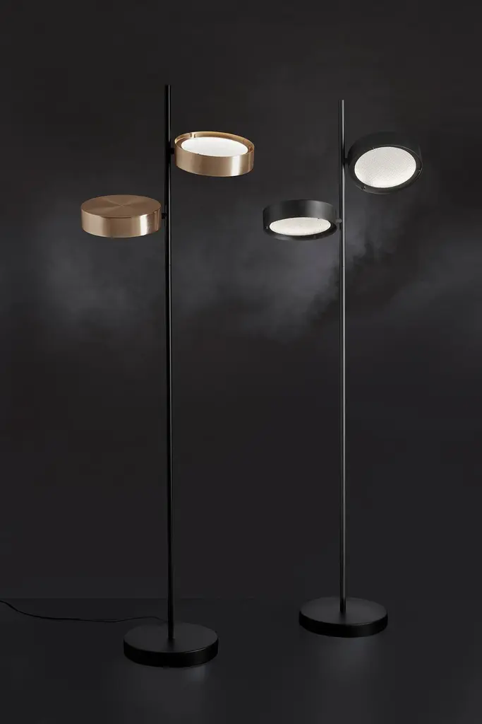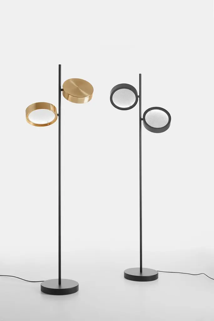 Echoes of bygone eras reinterpreted with refined contemporary precision. The elegance of Berlin is embodied in the metal ring diffusers with their considerable thickness and slender profile, enclosing decorative wired glass discs. The diffusers, supported by a slender, tubular stem, can be rotated 360° to suit the lighting requirements. Berlin is available in a floor version with two diffusers and a suspension version with four diffusers, both available in an anodised brass and matt black finish.Available in Matt Black, Anodized Brass2 x 15 W (LED)2700°K - 2150 lm - CRI>85 dimmer