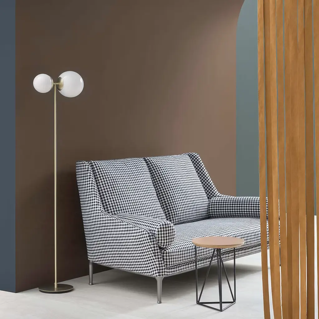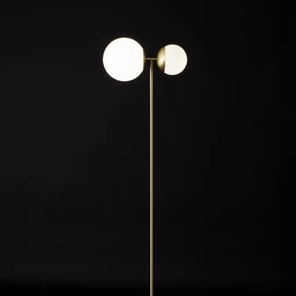 Elegant and modern, this floor lamp was designed by Lorenza Bozzoli as part of the Biba collection, distinctive for poetic contrasts in silhouettes, finishes, and colors. In this case, the structure of satin-finished brass supports the two shades shaped as spheres of two different sizes. The sophisticated glow of the light creates a delicate ambiance that will suit a contemporary home, either alone or combined with other items in the same series.