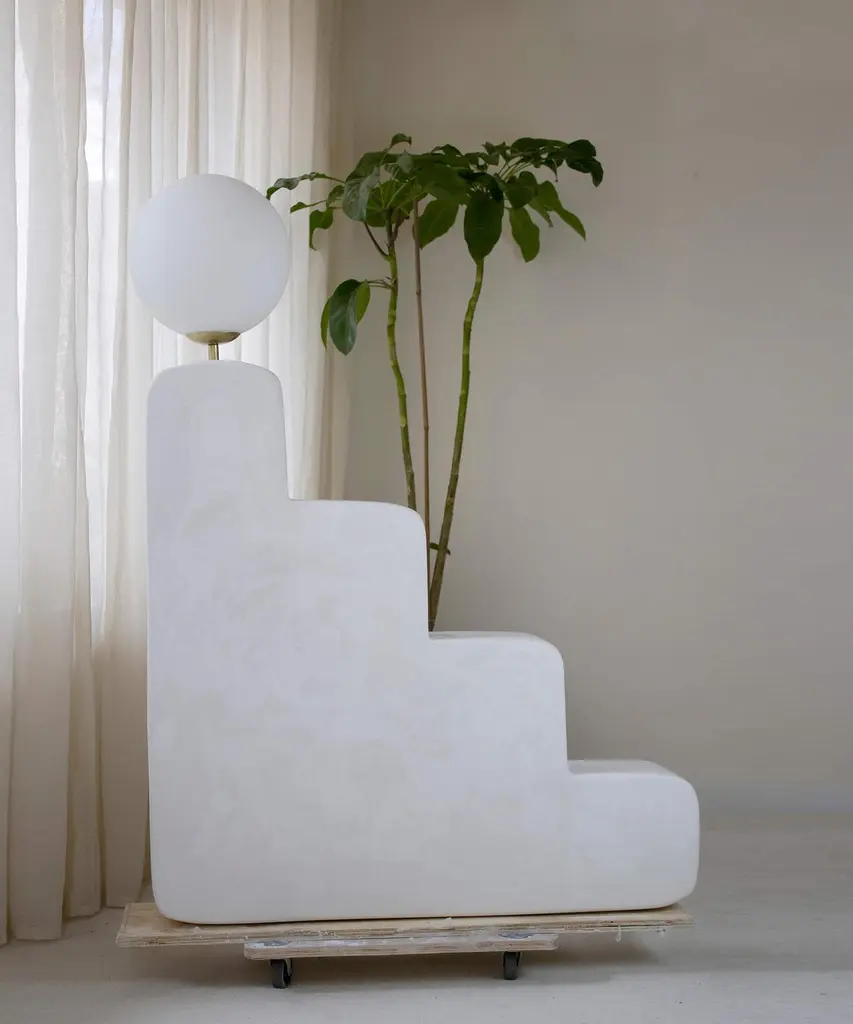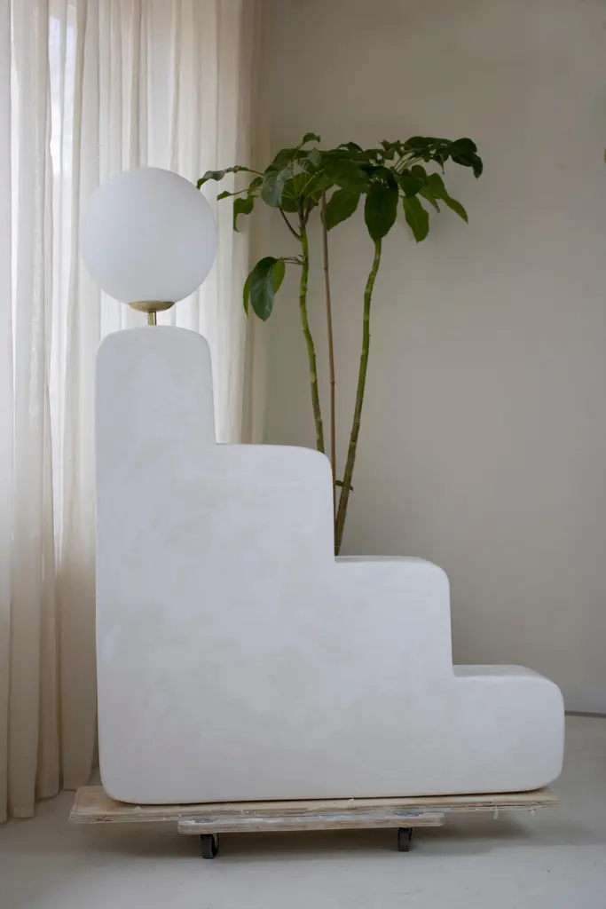 Big Step lamp by AOAODimensions: W 100 x D 16 x H 135 cmMaterials: White plasterColor options available upon request.The idea was born after deciding to reconnect with my family and my grandfather – a sculptor artist. Learning to sculpt and being a designer compelled me to combine these two mediums and use their best values. Experimenting with the functionality of sculpture and the meaning of furniture led me to create the collection.Studio AOAO is an interdisciplinary studio combining art and design. It was created by Alicja Strzyzynska and Onur Iseri in Amsterdam in 2020. “We specialise in making sculptural pieces by experimenting with the functionality of sculpture and the meaning of furniture. In our works, we focus on the emotional connection between the object and the user. All of our work seeks the experience of intimacy and the metaphysical bond between personal interaction and meaningful narrative. Through sculptural value and reflective design, we aim to create pieces that last for generations and help reduce environmental waste.”The inspiration to sculpt came from Alicja’s roots, her grandfather – an artist sculptor. Alicja completed Masters of Arts Degree in Product and Visual Communication Design at Warsaw Academy of Fine Arts and finished her bachelor degree in Interior Architecture. Alicja previously worked in Tokyo and Amsterdam in architectural design studios. Onur completed his business studies in Japan and worked in digital design & marketing as well as teaching in Tokyo.The studio’s first collection debuted at Rossana Orlandi Gallery during Milan Design Week 2021. The studio currently collaborates with RO Gallery and Galerie Philia.