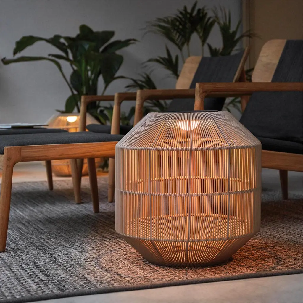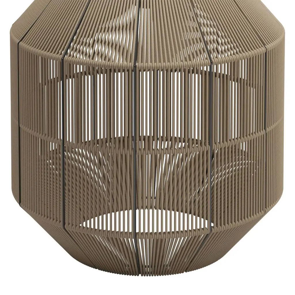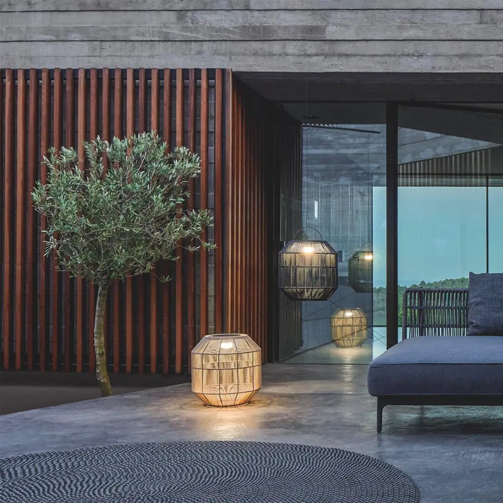 Floor lamp bird cage outdoor in all weather woven wicker over powder coated in natural finish with stainless steel frame. With mains power and solar rechargable LED light unit.With remote control radio frequency with 8 light output settings. Battery life of approximately 8 hours on maximum light setting. Remote control working distance for of up to 35m.Also available in black finish, on request.