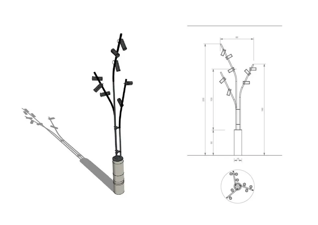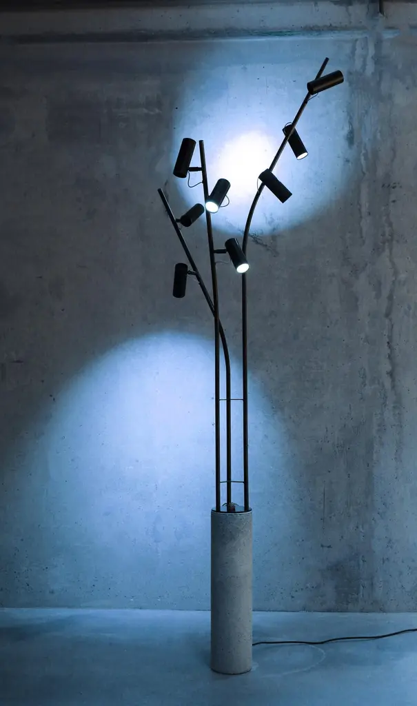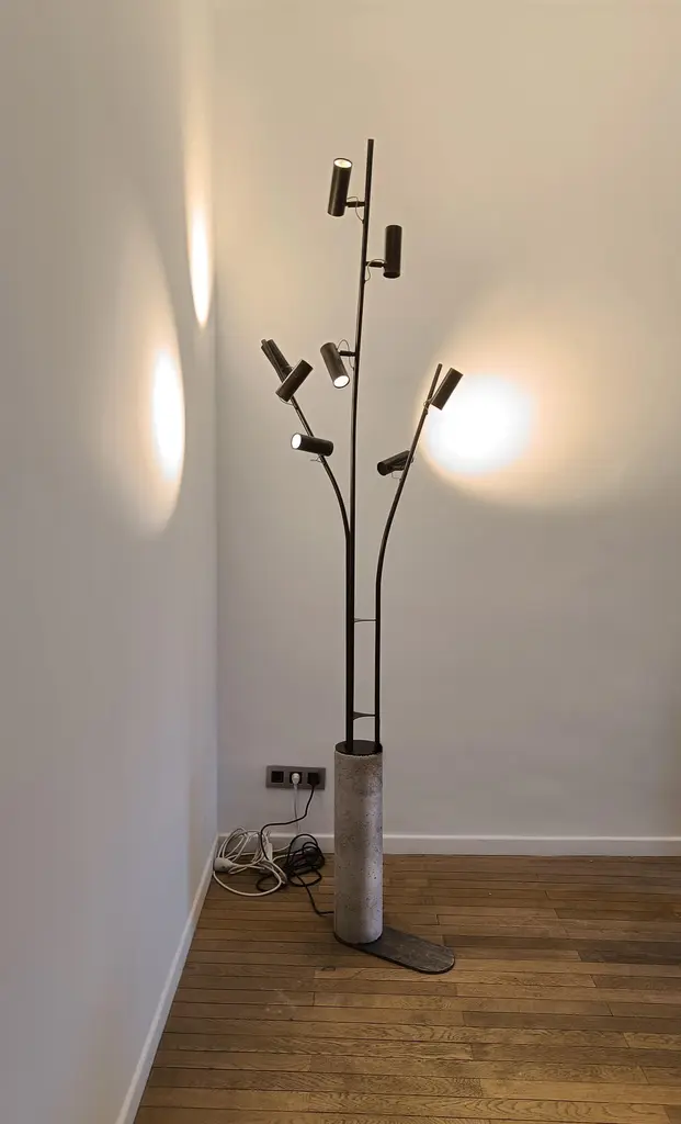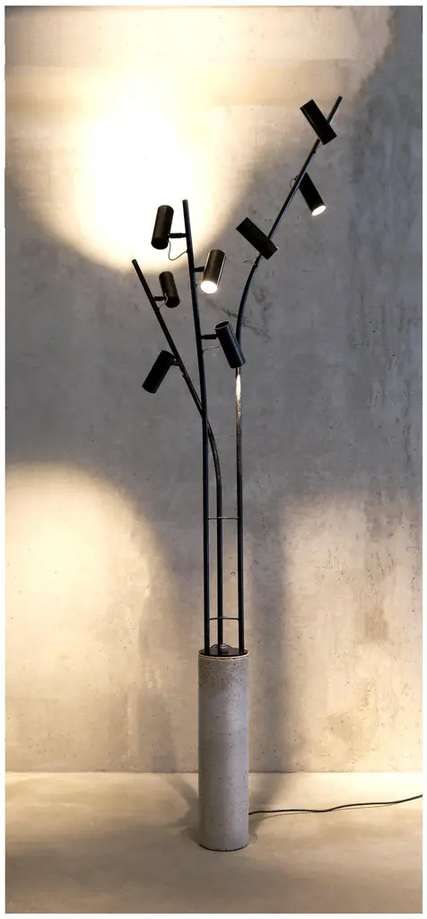 Design LungooConcrete base / pedestal / dimensions 60cmheight, diameter 15cm3 blanc steel or iron tubes chemically blackened / 180 length, 3 lamps – 135 length , 3 lamps – 135 length, 2 lampsTotal 8 dimmable, directional spotlights, 2 circuits, handled by a switchOverall dimensions,Height 220cm , diameter 65cm, weight ( concrete base 21kg, steel lamp part 7kg) The lamp stands like a solitary tree in its surroundings, 8 birds rest there. When the lamps light up from a dim position, they illuminate the surroundings. The lamp and the bird spots then form a discreet shadow in a wealth of light that takes up the entire surrounding spaceThe maneuverable spotlights allow you to either very focused and just very omni different spots. The lamp does not want to stand out in its shadow but rather to light up the interior, works of art, or furniture.