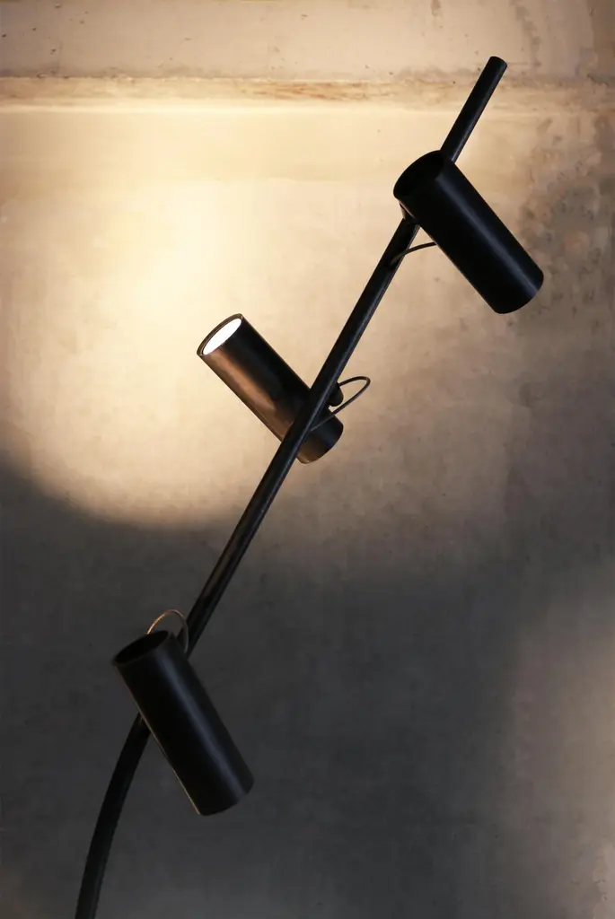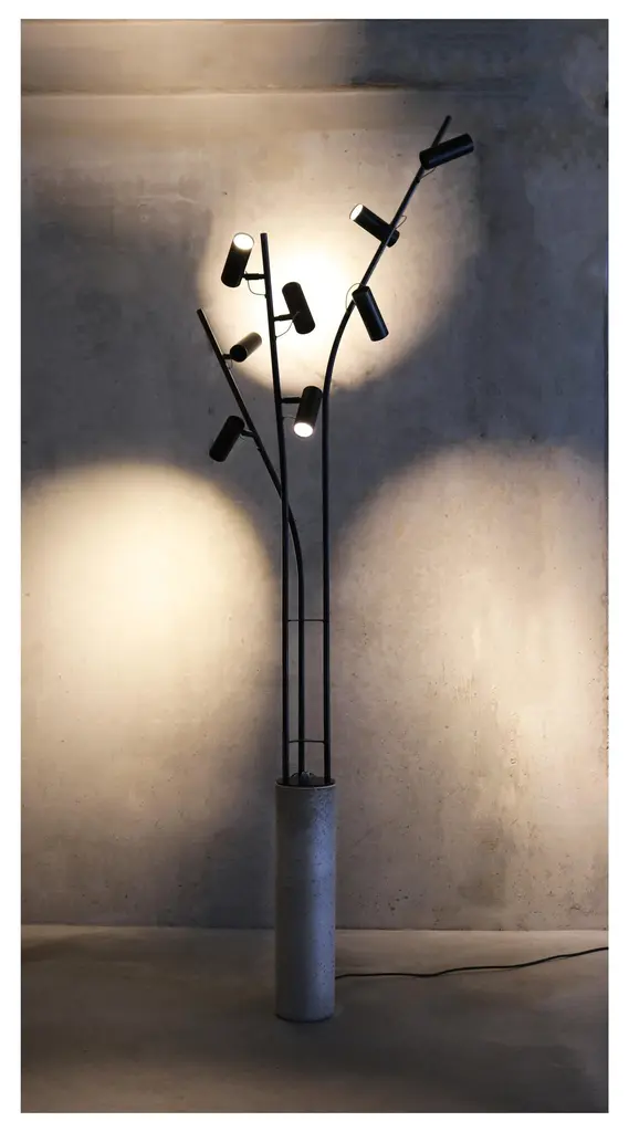 Design LungooConcrete base / pedestal / dimensions 60cmheight, diameter 15cm3 blanc steel or iron tubes chemically blackened / 180 length, 3 lamps – 135 length , 3 lamps – 135 length, 2 lampsTotal 8 dimmable, directional spotlights, 2 circuits, handled by a switchOverall dimensions,Height 220cm , diameter 65cm, weight ( concrete base 21kg, steel lamp part 7kg) The lamp stands like a solitary tree in its surroundings, 8 birds rest there. When the lamps light up from a dim position, they illuminate the surroundings. The lamp and the bird spots then form a discreet shadow in a wealth of light that takes up the entire surrounding spaceThe maneuverable spotlights allow you to either very focused and just very omni different spots. The lamp does not want to stand out in its shadow but rather to light up the interior, works of art, or furniture.