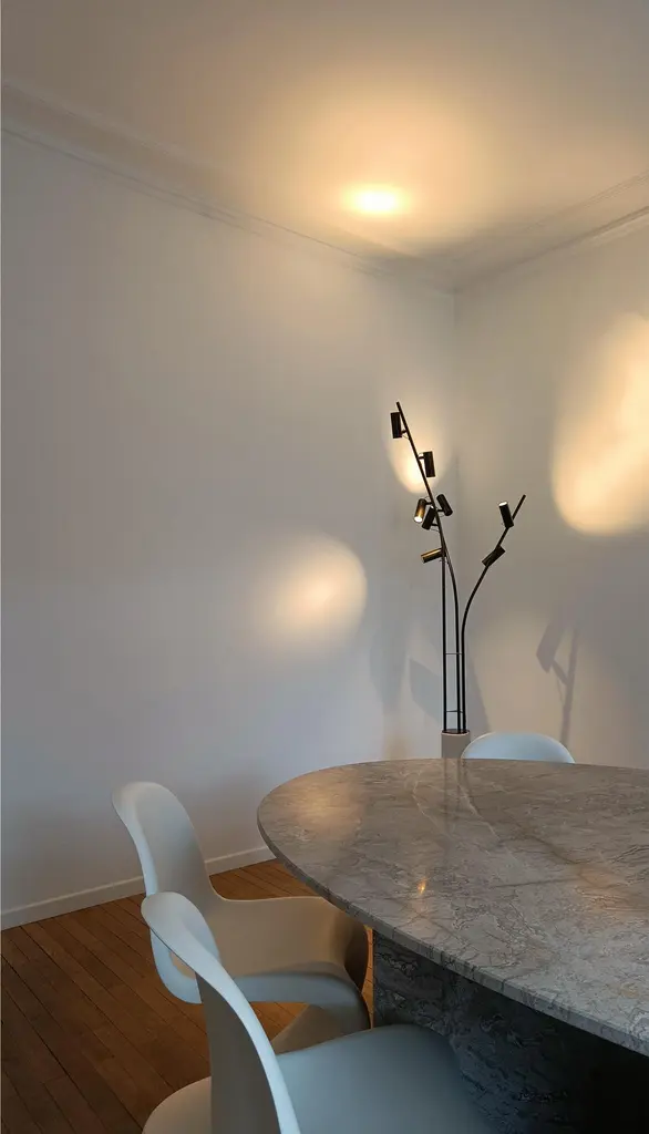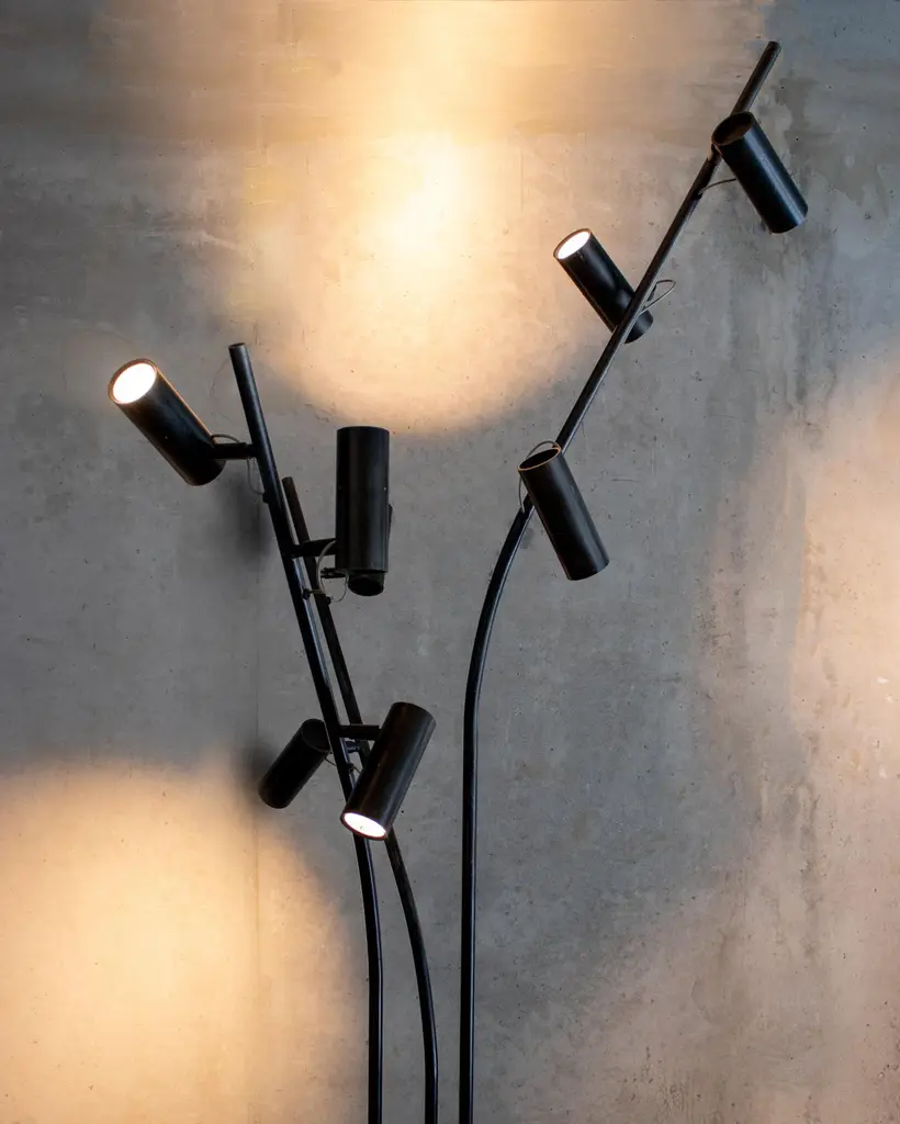 Design LungooConcrete base / pedestal / dimensions 60cmheight, diameter 15cm3 blanc steel or iron tubes chemically blackened / 180 length, 3 lamps – 135 length , 3 lamps – 135 length, 2 lampsTotal 8 dimmable, directional spotlights, 2 circuits, handled by a switchOverall dimensions,Height 220cm , diameter 65cm, weight ( concrete base 21kg, steel lamp part 7kg) The lamp stands like a solitary tree in its surroundings, 8 birds rest there. When the lamps light up from a dim position, they illuminate the surroundings. The lamp and the bird spots then form a discreet shadow in a wealth of light that takes up the entire surrounding spaceThe maneuverable spotlights allow you to either very focused and just very omni different spots. The lamp does not want to stand out in its shadow but rather to light up the interior, works of art, or furniture.