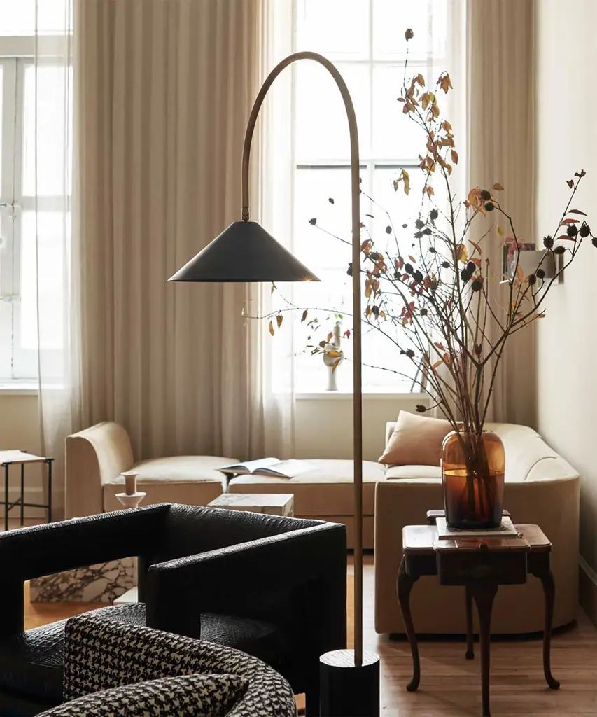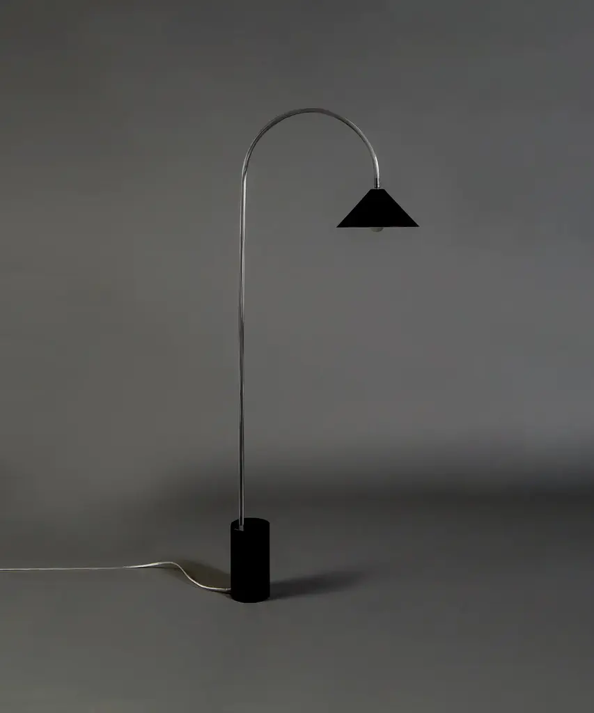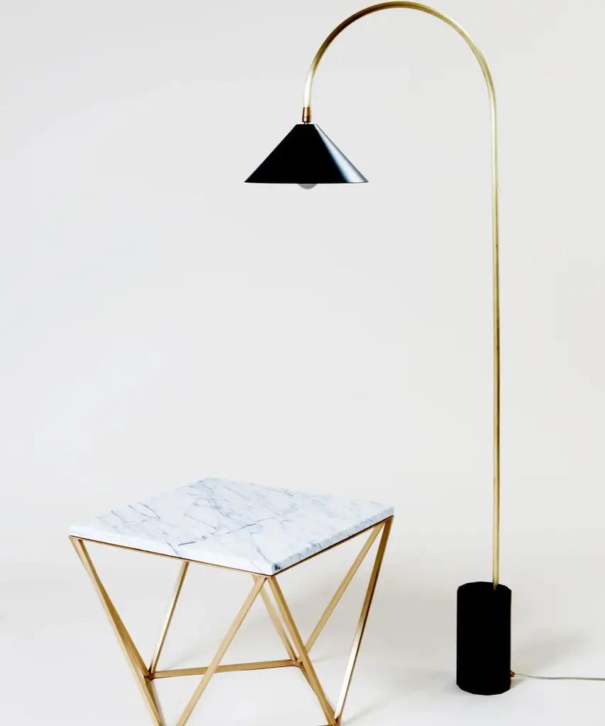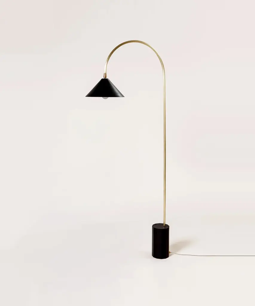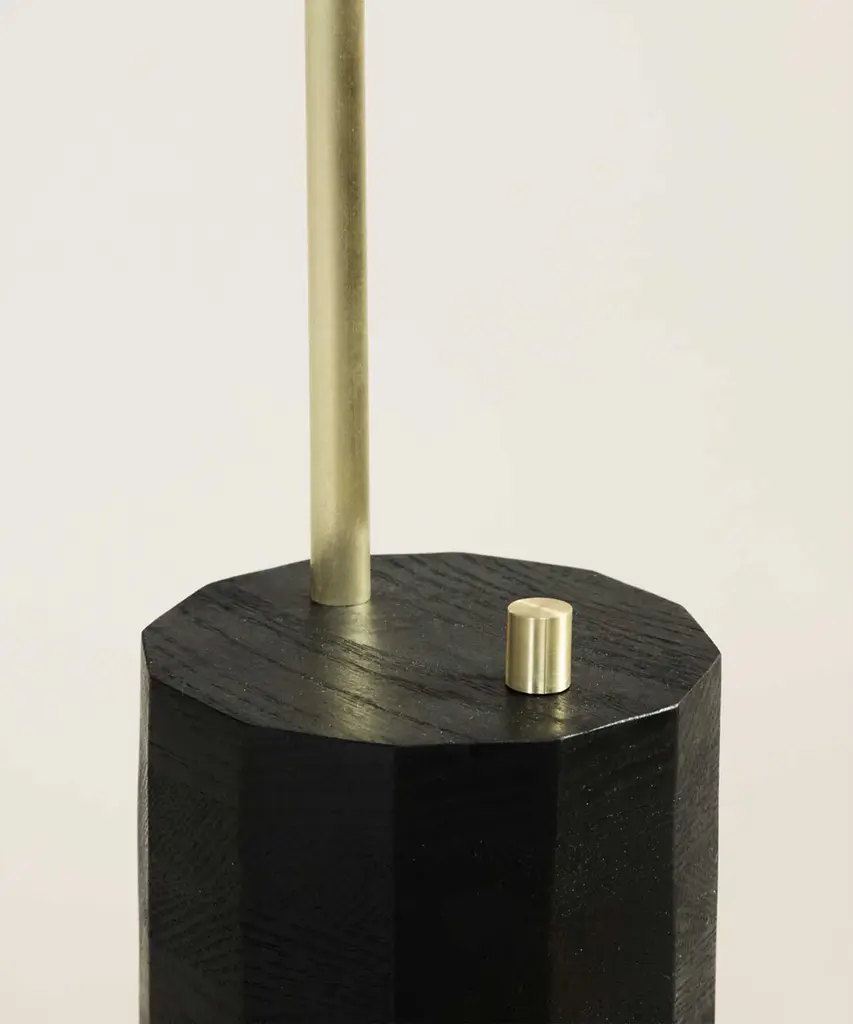 Inspired by Bishop Hook's cast iron lamps that illuminate the Williamsburg Bridge, the Bishop Series is equally timeless, yet modern. The lamps feature a hexagonal wood base (available in a range of finishes), heavily weighted for stability. The floor lamp versions also come with a removable metal base plate for added stability in high-traffic areas. The lamps are furnished with a clear cord with an on/off switch. Pictured with a blackened-steel hand-spun shade, brushed-brass curved neck, and ebony-stained ash-wood base, the latter two components are available in a range of finishes. Each piece is designed and hand-produced by Coil + Drift, a lauded New York's Catskill Mountains-based design studio known for its vividly three-dimensional and material-forward collections.