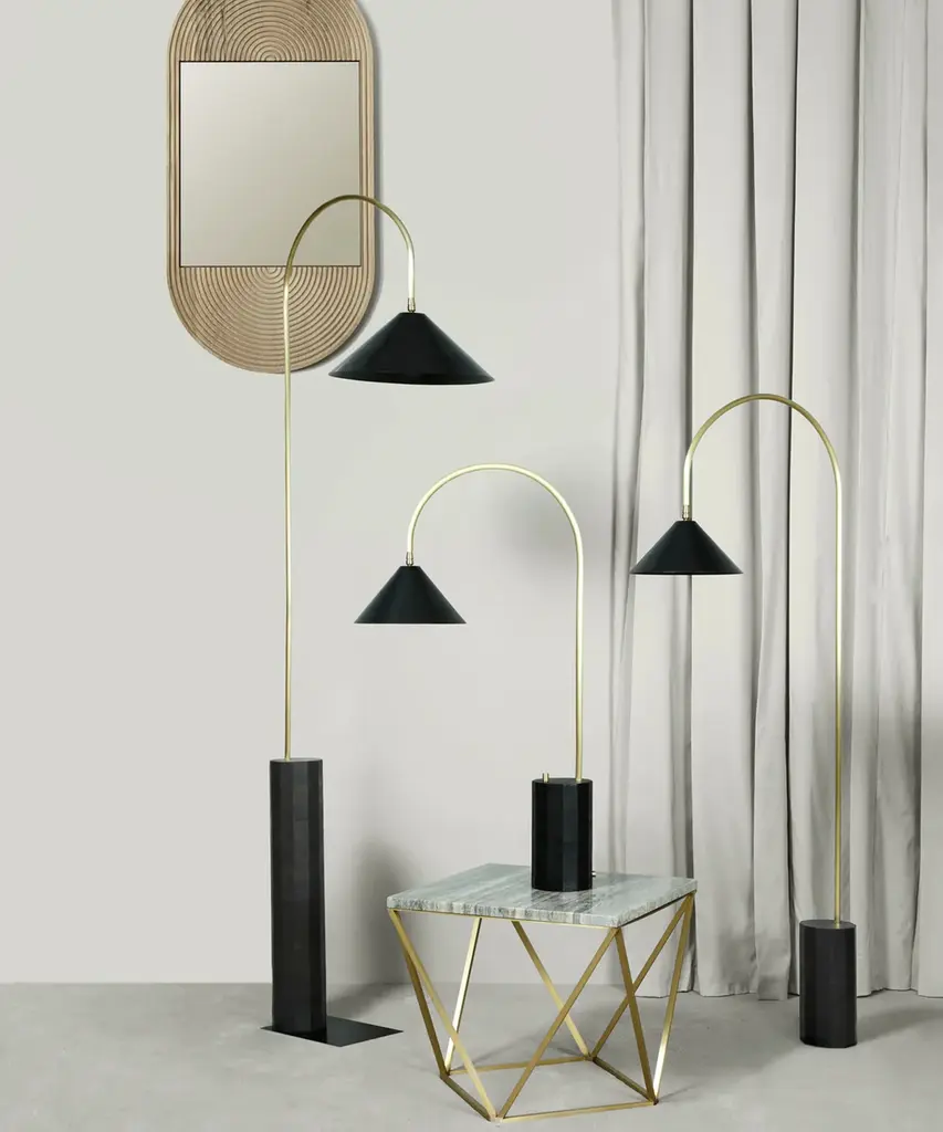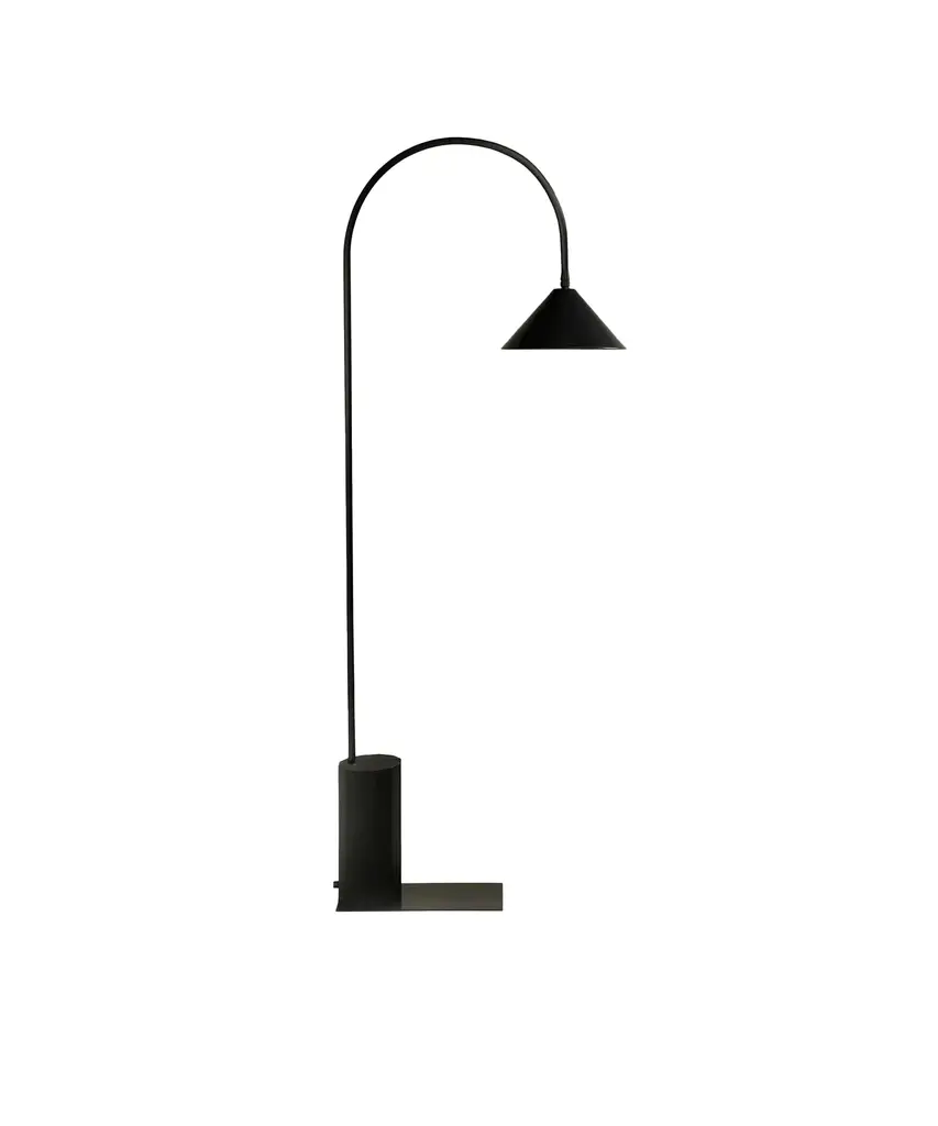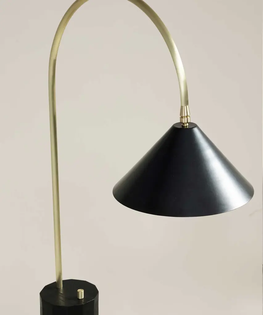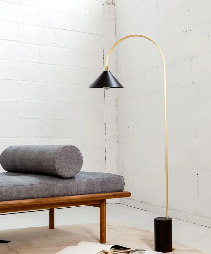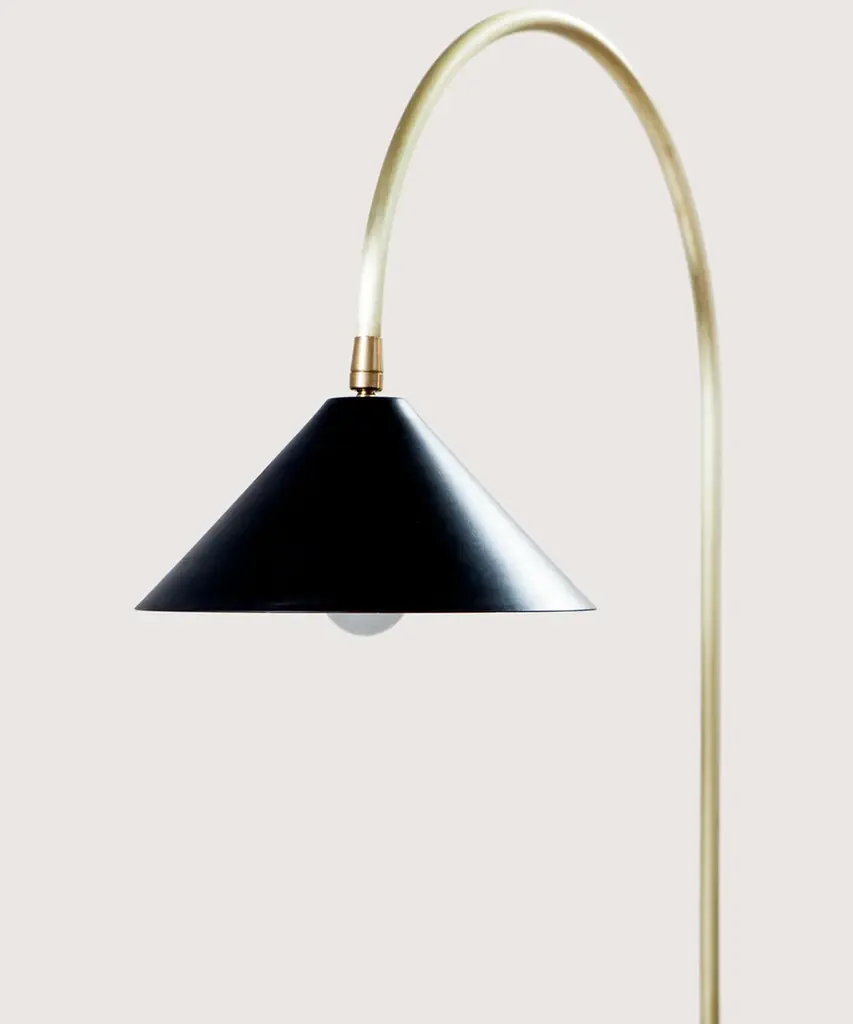 Inspired by Bishop Hook's cast iron lamps that illuminate the Williamsburg Bridge, the Bishop Series is equally timeless, yet modern. The lamps feature a hexagonal wood base (available in a range of finishes), heavily weighted for stability. The floor lamp versions also come with a removable metal base plate for added stability in high-traffic areas. The lamps are furnished with a clear cord with an on/off switch. Pictured with a blackened-steel hand-spun shade, brushed-brass curved neck, and ebony-stained ash-wood base, the latter two components are available in a range of finishes. Each piece is designed and hand-produced by Coil + Drift, a lauded New York's Catskill Mountains-based design studio known for its vividly three-dimensional and material-forward collections.
