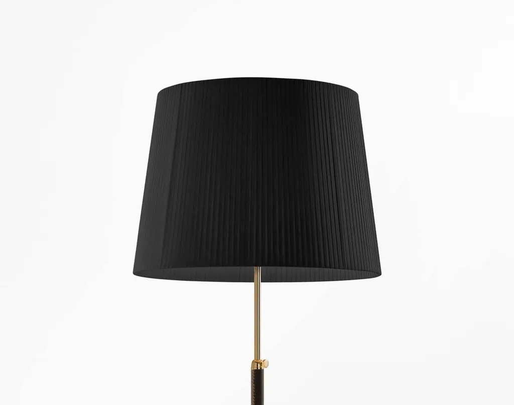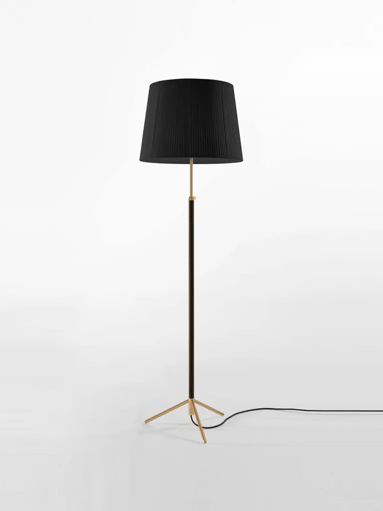 Black and brass Pie de Salón G1 floor lamp by Jaume SansDimensions: D 45 x H 120-160 cmMaterials: Metal, leather, ribbon.Available in chrome-plated or polished brass structure.Available in other shade colors and sizes.This slender synthesis of traditional lamps is a sparkle of timeless elegance created in a context of the avant-garde. The combination of materials with its symmetrical, leather-wrapped centre shaft, its choice of three shade materials and eight colour options make it a paradigm of industrial craftsmanship.Height adjustable lampshade.Dimmer included.Santa & Cole is a small, independent and global editor of design products, with its roots in Belloch (Barcelona, Spain). We have been editing since 1985, when the company was first founded. By editing we mean preparing a work for the public domain, we mean adapting an item for everyone’s use. What a book editor does with stories, we do with objects.More than eighty creators have contributed to a rich catalogue of furniture and lighting products originating in very different contexts, by renowned designers such as Antoni Arola, Miguel Milá, André Ricard and llmari Tapiovaara.Acute and attentive to quality and detail, Santa & Cole outsources all of its industrial production to an extensive network of suppliers, mainly in Spain, but also in other countries such as Japan, where the washi paper for our Tekiò lamp is made.Our mission is to build, safeguard and disseminate knowledge through design objects. Objects whose quality is recognisable at the touch of a hand, and that enrich people’s lives, whether at home or in shared environments. Our philosophy is more modern than futurist and we are more intrigued by silence than by stridency.Our focus is not the present market, but the future one; not Barcelona, but the world; not fashion, but history.All our lamps can be wired according to each country. If sold to the USA it will be wired for the USA for instance.