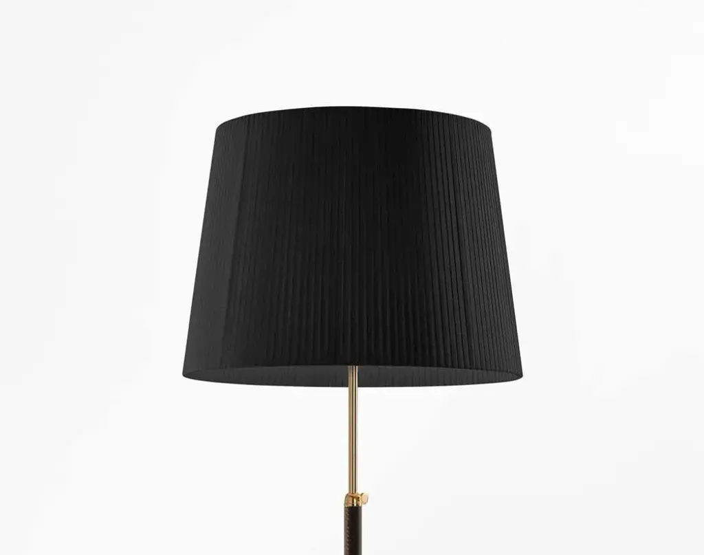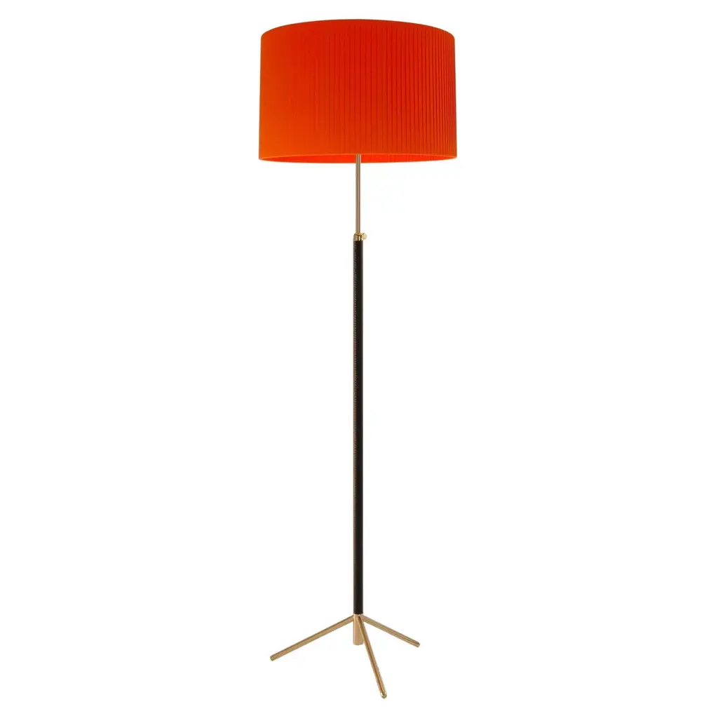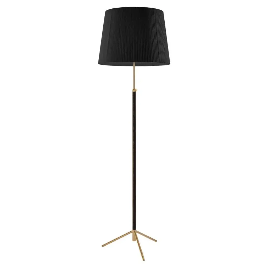 Black and brass pie de salón g1 floor lamp by jaume sans dimensions: d 45 x h 120-160 cm materials: metal, leather, ribbon. Available in chrome-plated or polished brass structure. Available in other shade colors and sizes. This slender synthesis of traditional lamps is a sparkle of timeless elegance created in a context of the avant-garde. The combination of materials with its symmetrical, leather-wrapped centre shaft, its choice of three shade materials and eight colour options make it a paradigm of industrial craftsmanship. Height adjustable lampshade. Dimmer included. this piece is attributed to the mentioned designer/maker. It has no attribution mark and no official proof of authenticity, however it is well documented in design history. I take full responsibility for any authenticity issues arising from misattribution, up to 250v (europe/uk standard).