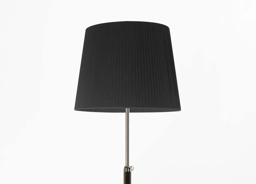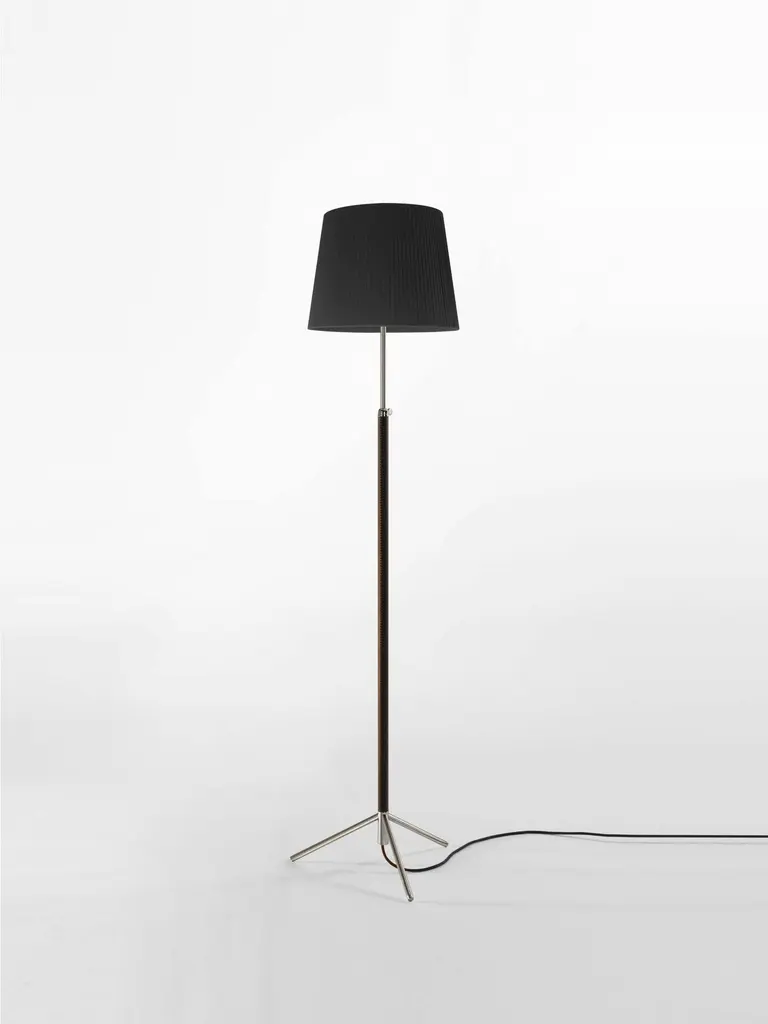 Black and Chrome Pie de Salón G3 floor lamp by Jaume SansDimensions: D 40 x H 120-160 cmMaterials: Metal, leather, ribbon.Available in chrome-plated or polished brass structure.Available in other shade colors and sizes.This slender synthesis of traditional lamps is a sparkle of timeless elegance created in a context of the avant-garde. The combination of materials with its symmetrical, leather-wrapped centre shaft, its choice of three shade materials and eight colour options make it a paradigm of industrial craftsmanship.Height adjustable lampshade.Dimmer included.Santa & Cole is a small, independent and global editor of design products, with its roots in Belloch (Barcelona, Spain). We have been editing since 1985, when the company was first founded. By editing we mean preparing a work for the public domain, we mean adapting an item for everyone’s use. What a book editor does with stories, we do with objects.More than eighty creators have contributed to a rich catalogue of furniture and lighting products originating in very different contexts, by renowned designers such as Antoni Arola, Miguel Milá, André Ricard and llmari Tapiovaara.Acute and attentive to quality and detail, Santa & Cole outsources all of its industrial production to an extensive network of suppliers, mainly in Spain, but also in other countries such as Japan, where the washi paper for our Tekiò lamp is made.Our mission is to build, safeguard and disseminate knowledge through design objects. Objects whose quality is recognisable at the touch of a hand, and that enrich people’s lives, whether at home or in shared environments. Our philosophy is more modern than futurist and we are more intrigued by silence than by stridency.Our focus is not the present market, but the future one; not Barcelona, but the world; not fashion, but history.All our lamps can be wired according to each country. If sold to the USA it will be wired for the USA for instance.