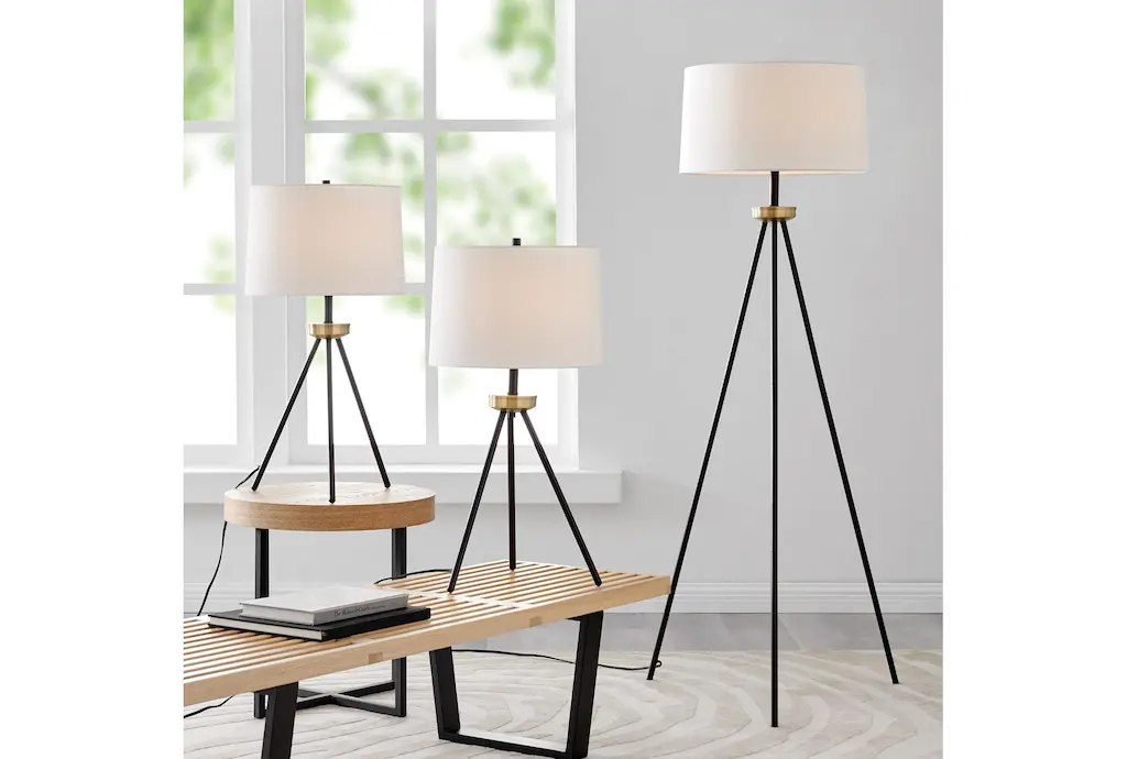 Black + Antique Brass Metal Tripod Table + Floor Lamps 3 Piece Set