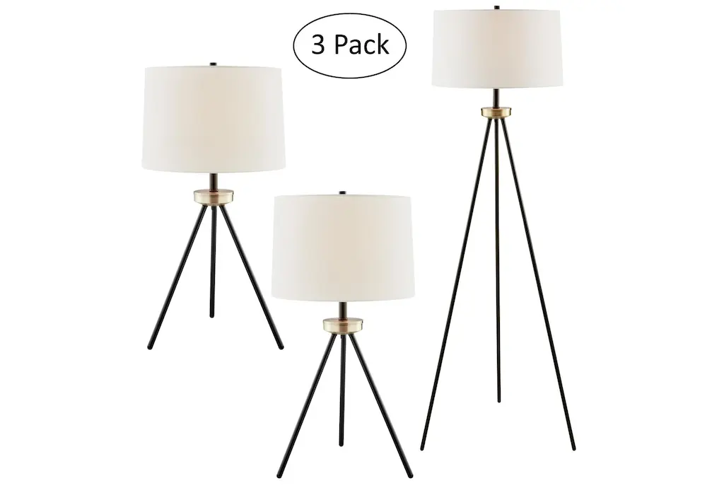 Illuminate your home with the Black + Antique Brass Metal Tripod Table + Floor Lamps 3 Piece Set. This modern set includes both table and floor lamps, perfect for adding sophisticated lighting to your bedroom or living room. The metal construction ensures durability, while the antique brass accents provide a touch of retro charm.