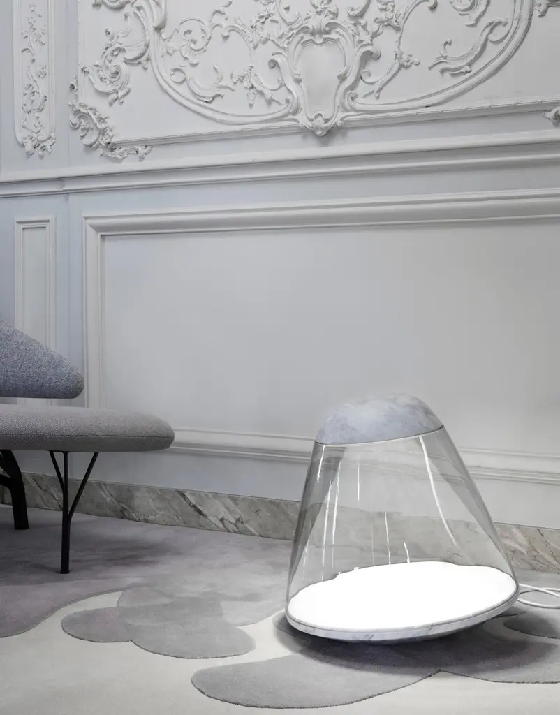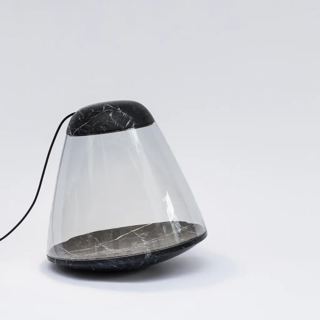 Apollo floor lamp, Dan Yeffet & Lucie KoldovaApollo is a floor lamp combining the brutality of marble with the lightness and transparency of glass. The light beam showcases the beauty and details of the material. Apollo’s titled base makes it look like the lamp just landed, like the American space capsule that inspired its name.Materials: Blown glass, Carrara or Marquina marble (Black version), and LED lightingDimensions, volume and weightHeight: 17.7 inchesDiameter: 16.9 inchesWeight: 33 lbsLighting power: 1000 lmVoltage: 210-220 VElectric wire lenght: 59 inchesDan Yeffet is Israëli, Lucie Koldova is from Czech Republic. They met whilst collaborating with designers Arik Levi and began to work together in 2010. Since then, their creations have been shown in various galleries in Paris, New York, and Prague.