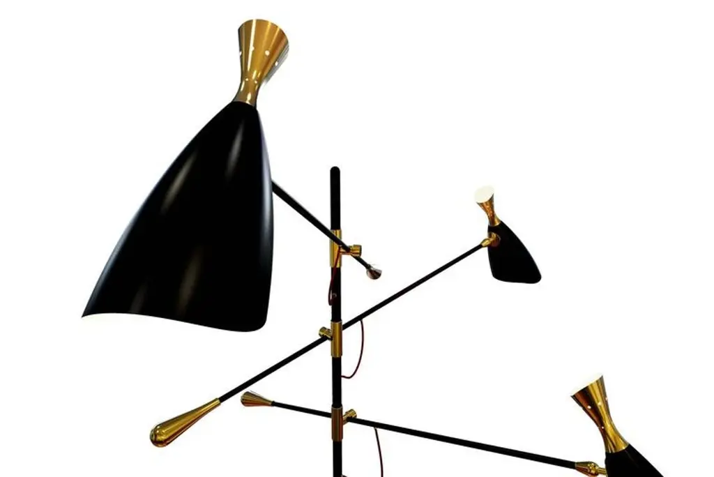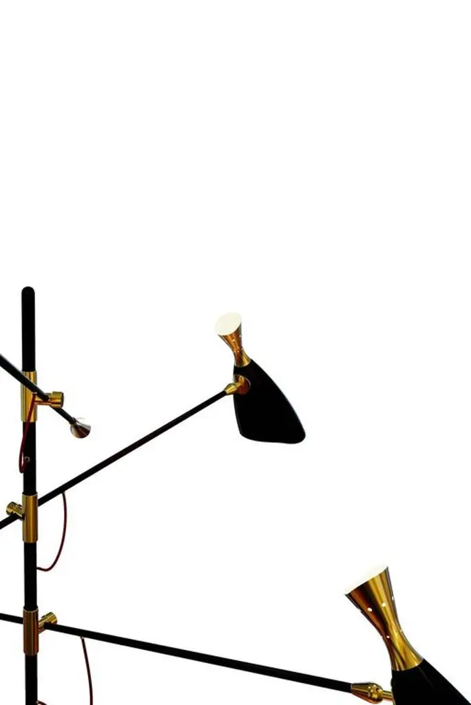Floor lamp black lounge with aluminium and brushed brass.Black matte outside and white matte inside.Red textile wire and nine G9 bulbs included.