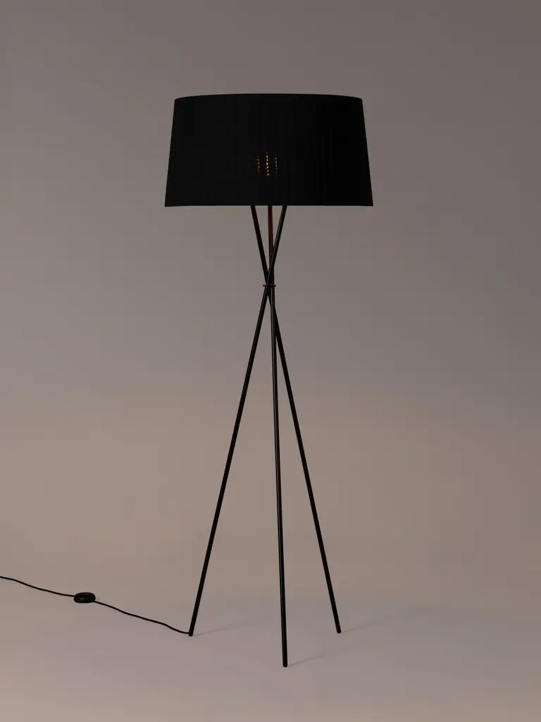 Black Trípode G5 floor lamp by Santa & Cole.Dimensions: D 62 x H 168 cm.Materials: metal, ribbon.Available in other colors.Trípode humanises neutral spaces with its colourful and functional sobriety. The shade is hand ribboned and its base could not be more stable. Switched on, it provides a characteristic, warm light, rich in nuances. Switched off, it is a small volumetric sculpture that invites immediate use.Dimmer included.Santa & Cole is a small, independent and global editor of design products, with its roots in Belloch (Barcelona, Spain). We have been editing since 1985, when the company was first founded. By editing we mean preparing a work for the public domain, we mean adapting an item for everyone’s use. What a book editor does with stories, we do with objects.More than eighty creators have contributed to a rich catalogue of furniture and lighting products originating in very different contexts, by renowned designers such as Antoni Arola, Miguel Milá, André Ricard and llmari Tapiovaara.Acute and attentive to quality and detail, Santa & Cole outsources all of its industrial production to an extensive network of suppliers, mainly in Spain, but also in other countries such as Japan, where the washi paper for our Tekiò lamp is made.Our mission is to build, safeguard and disseminate knowledge through design objects. Objects whose quality is recognisable at the touch of a hand, and that enrich people’s lives, whether at home or in shared environments. Our philosophy is more modern than futurist and we are more intrigued by silence than by stridency.Our focus is not the present market, but the future one; not Barcelona, but the world; not fashion, but history.All our lamps can be wired according to each country. If sold to the USA it will be wired for the USA for instance.