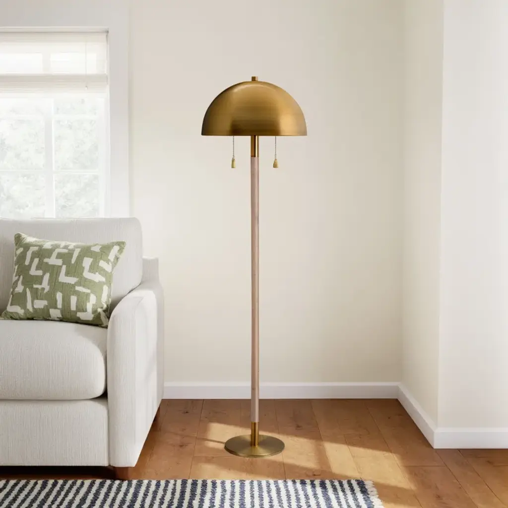 Beautifully burnished metal is the standout design element of this updated version of a classic floor lamp. A simply finished wood base tempers the warmth of the golden shade. It offers filtered and focused illumination and makes an inspired choice for the home or office.
