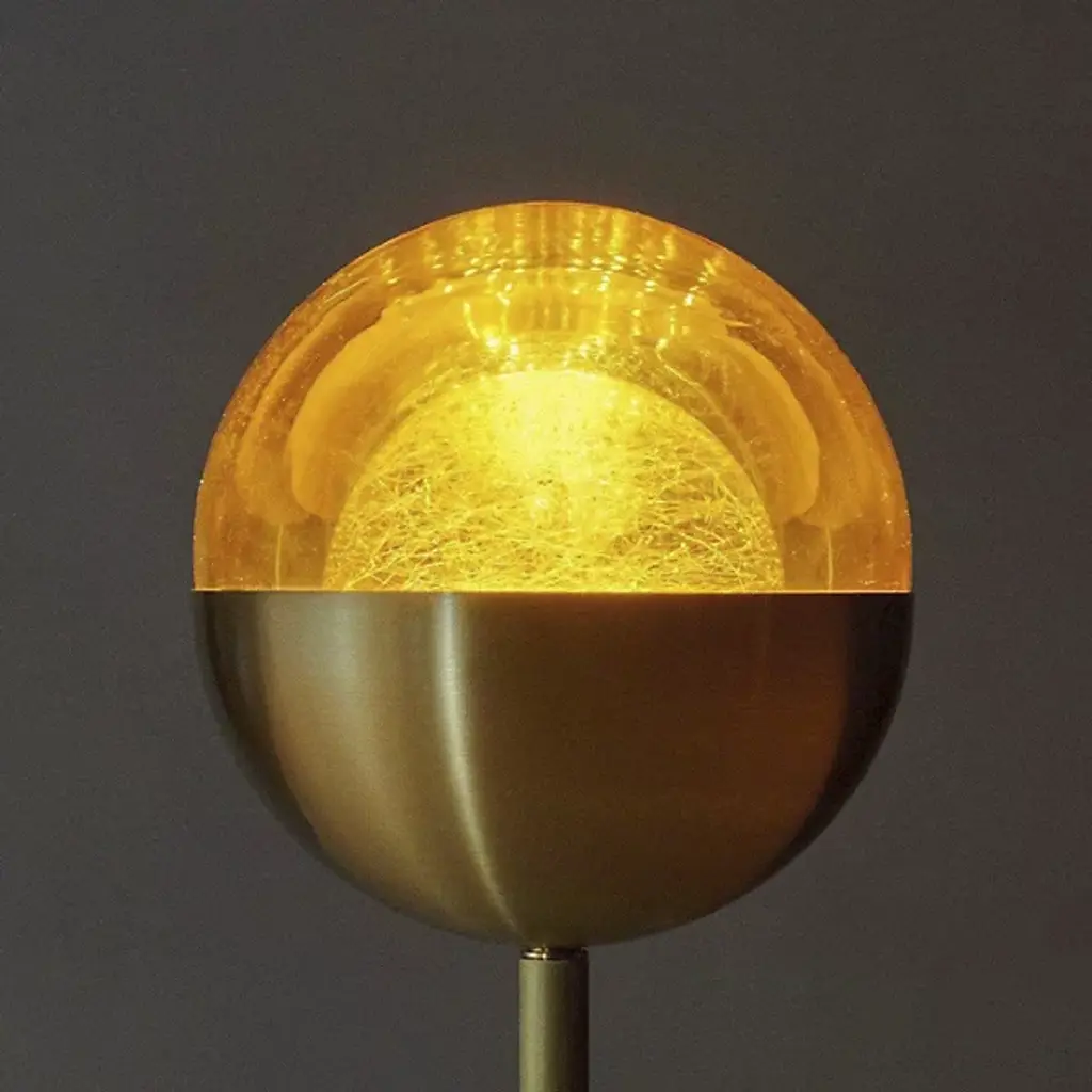Broadcast good taste with the engaging, retro presence of the Bloom Floor Lamp from Shakuff. A slender, stylish fixture starting with a disc base of naturally-veined marble, it transmits a slim central stem upward, terminating in a metal bowl housing that sweeps around strong lamping, capped by a clear glass diffuser and seating a smaller translucent orb within. Small lamps surrounded by the metal dome and glass orb shades extend from the sides of the stem orb and dome lamps, creating an arrangement that diffuses an elegant gleaming ambiance around the fixture.