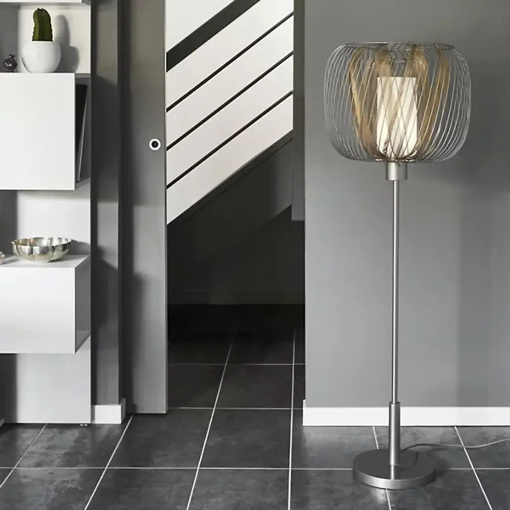 A dimensional piece with layers of expression. The Bodyless Floor Lamp by Forestier is designed by multi-talented designer Arik Levy and presents an intricate personality through layers of sleek iron wiring. Supported by a circular base and slender body, the shade is formed into a rounded silhouette to contain its inner screens. Each layer’s wiring is angled at an alternating direction to present a lively motif when viewed from any direction. A white fabric diffuser at its core contains its lamping and produces a soft, ambient light.