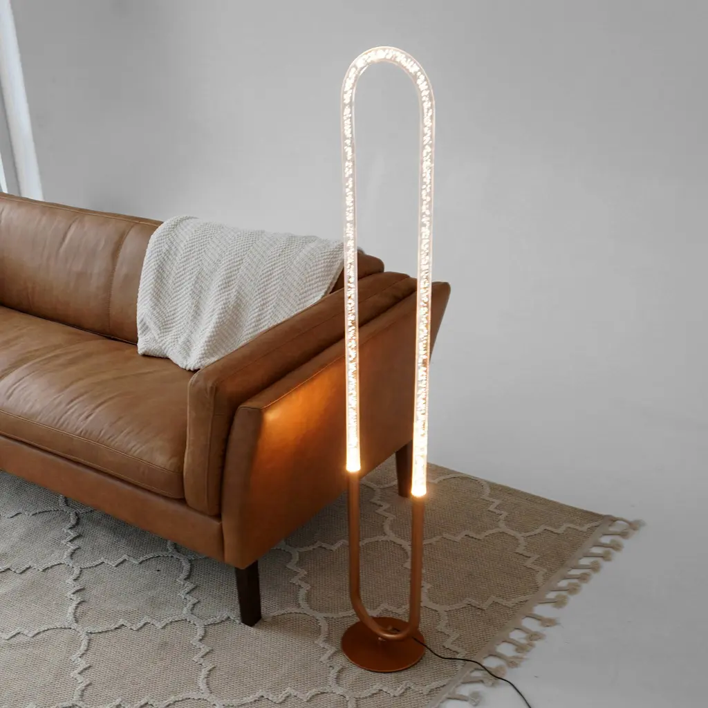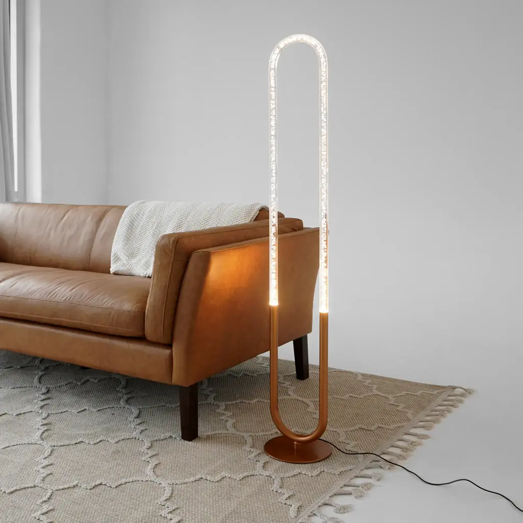 Elevate your living space with the Elegant Loop LED Floor Lamp. Combining modern design with functional brilliance, this lamp features a sleek U-shaped frame with integrated LED lights, perfect for creating a warm and inviting atmosphere. Its compact base and unique style make it an eye-catching addition to any room.Features: