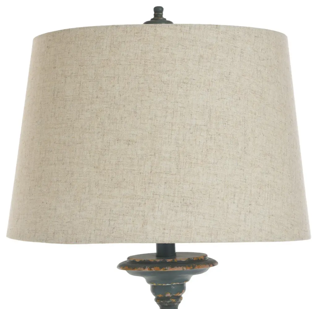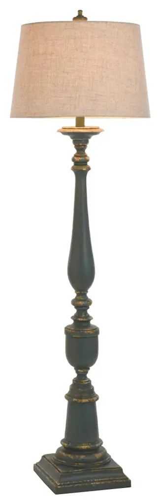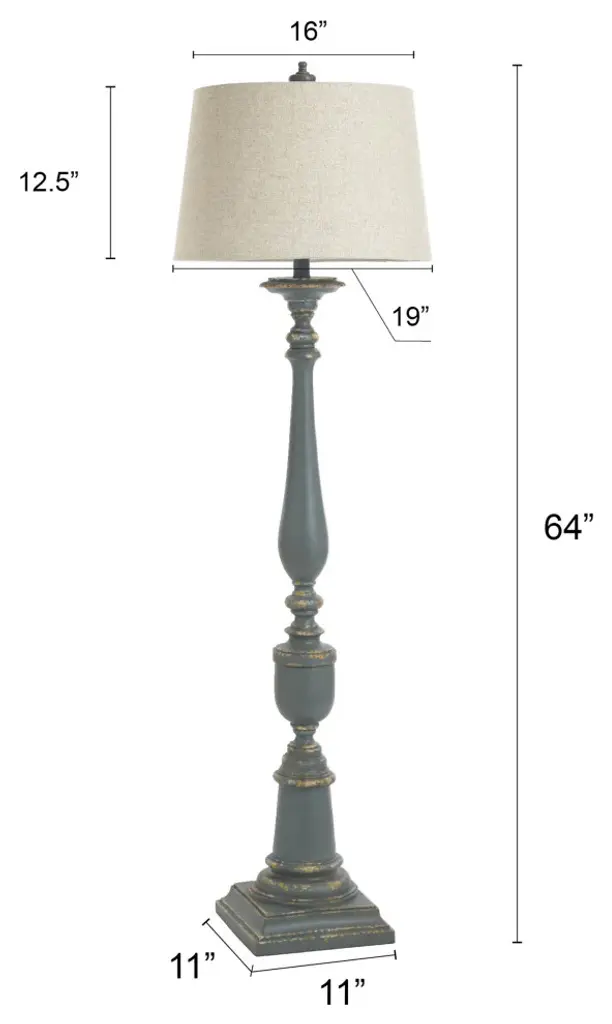 Accent your decor with this lovely Floor Lamp.Features: Finish: Sage, Distressing, Heathered OatmealShade Finish: Heather OatmealShade Shape: EmpireLength: 19 inchesWidth: 19 inchesHeight: 64 inchesSwitch Type: Rotary 3-WayVoltage: 120Wattage: 150Safety Rating: Dry Location - This item is rated for dry locations, meaning it can be used in an indoor area that is not normally subject to dampness. May include a location subject to temporary dampness provided ventilation is adequate to prevent any accumulation of moisture such as the bathroomBulb(s) Included: NoBulb Type: IncandescentNumber of Bulbs: 1Due to lighting and monitor differences, actual colors and finishes may vary slightly from what appears online.