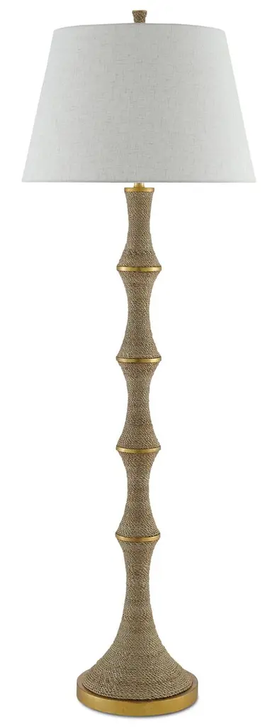 Bands of gold-leafed metal separate curvaceous abaca-wrapped sections of the lamp's stem. The woven cotton shade contributes more textural interest.