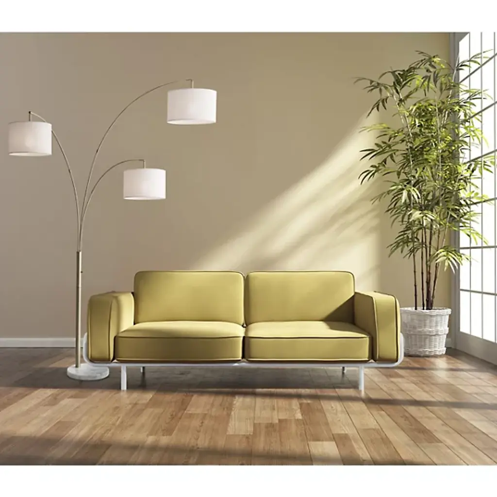 Add a full layer of light to your favorite space with the Bowery 3 Arm Arc Floor Lamp from Adesso. An eye-catching piece showcasing a modern farmhouse style, this piece provides overhead lighting adjustable by a set of three shade arms. A thick disc-shaped base made of marble upholds a rod body that leads to the splitting, yet graceful arms. Each drum-shaped shade is made of textured fabric and holds a single bulb, which emits a bright and welcoming illumination.