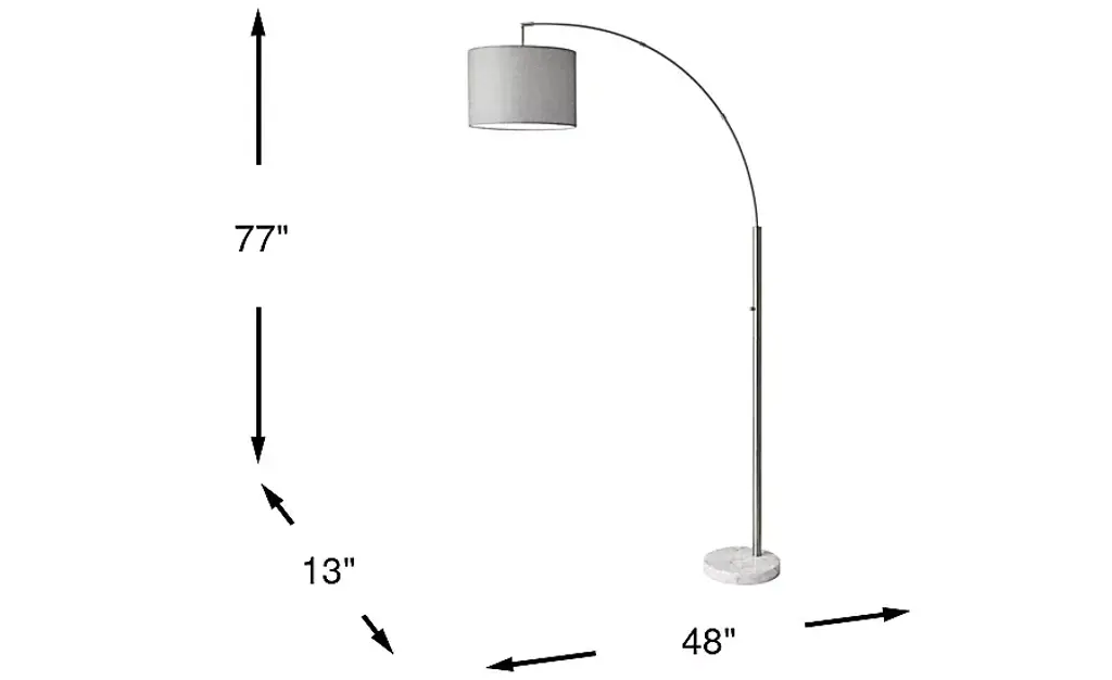 A classic mid-century look, the Bowery Town floor lamp is a modern accent that provides warm room-filling light. With a sleek silver finish on a slim curved design, this floor lamp compliments a variety of styles and color palettes. The marble base provides stability and grace while the soft gray fabric shade reveals a delicate texture when lit. Partial assembly may be required.