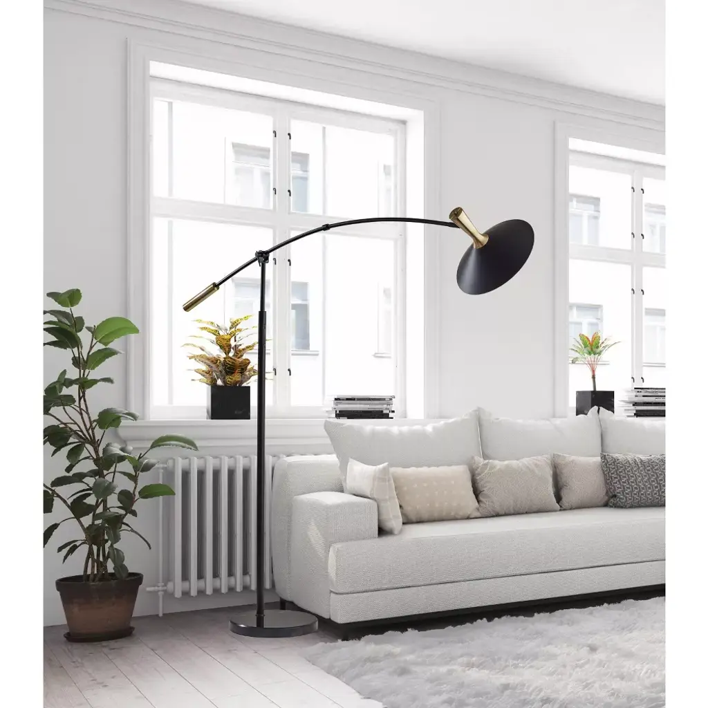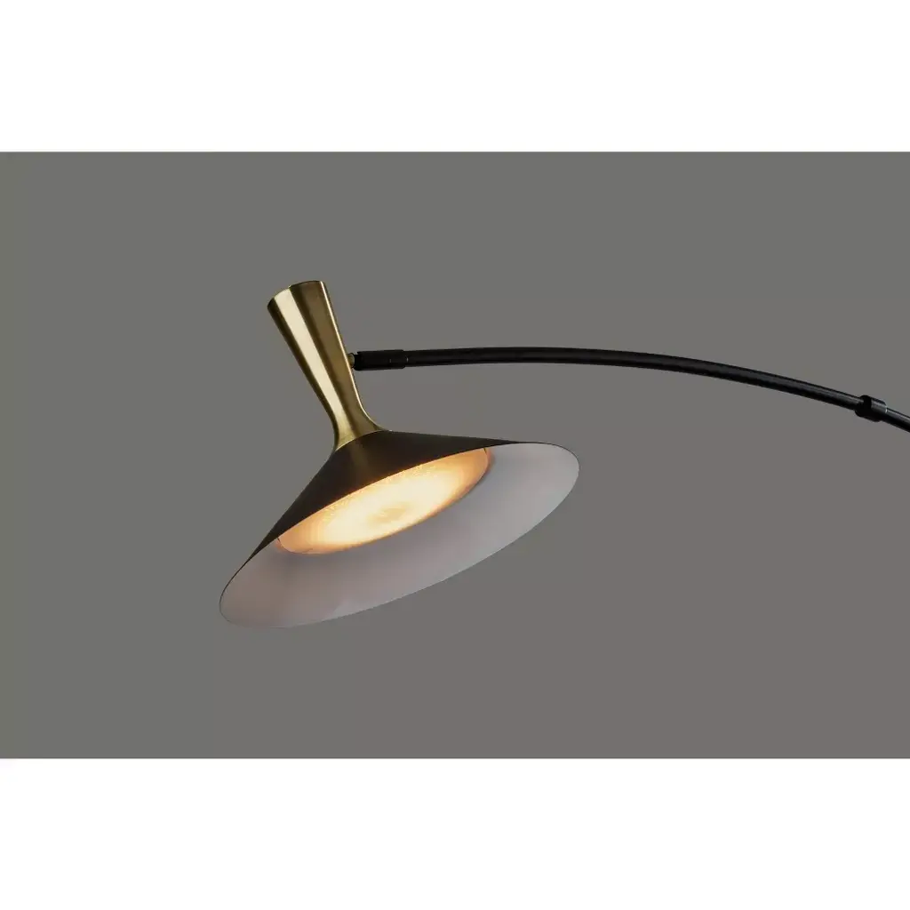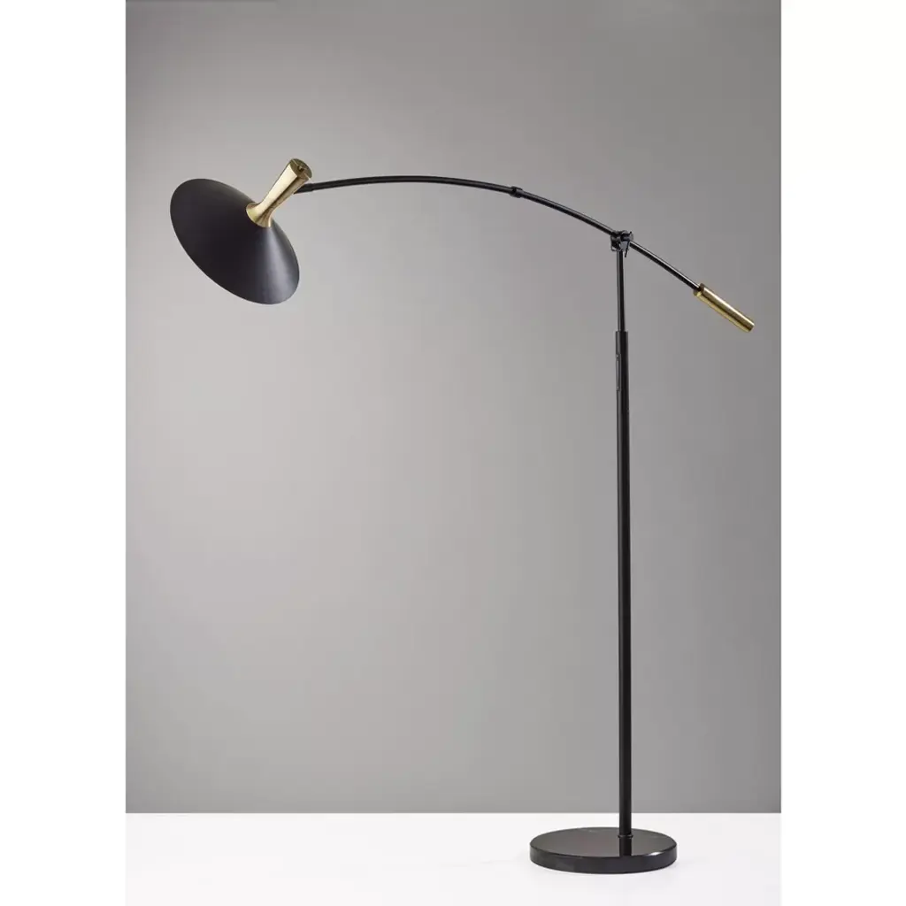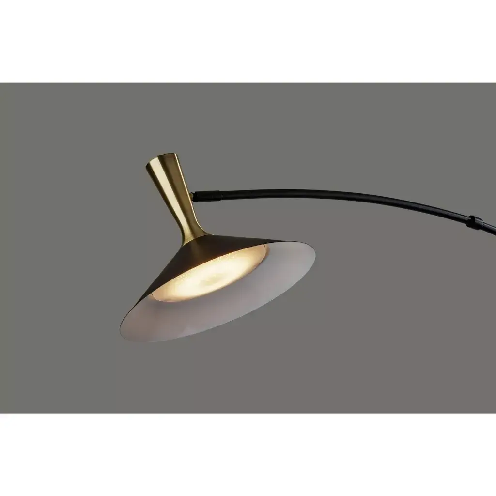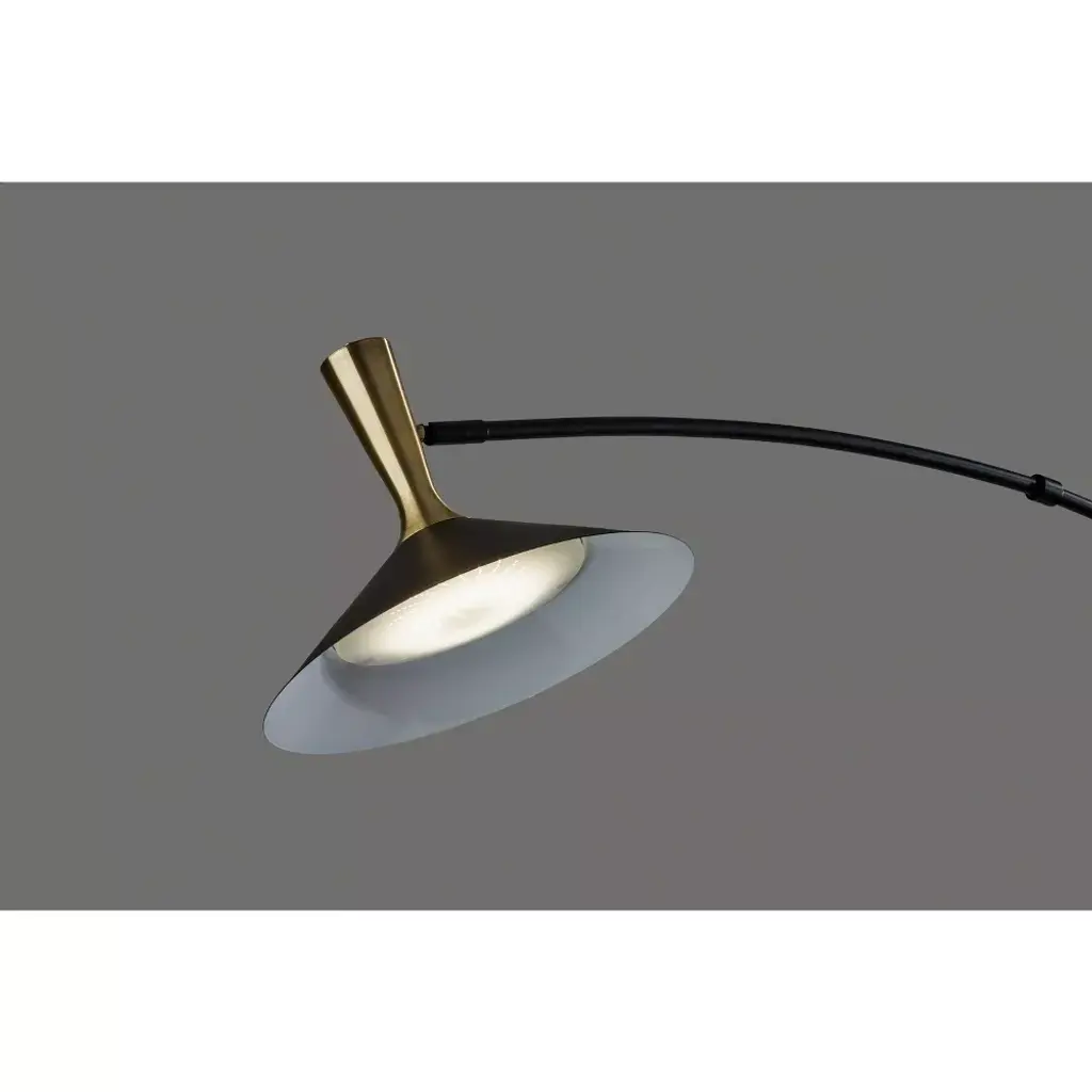 With sleek style lines, rich materials, and versatile lighting options, the Bradley LED arc lamp is the perfect choice to illuminate your space while enhancing contemporary and modern chic décor. Crafted of black metal with striking antique brass accents, the lamp features a slim stem leading to a sweeping arm that can be adjusted up and down and side to side to meet the needs of your space. To provide stability and add a touch of sophistication, the round base is made of black marble. The focal point of the lamp is the stunning black cone shade measuring 14" in diameter and featuring an antique brass accent. The shade can be adjusted and redirected to focus the light wherever it's needed and also houses an integrated 24W LED light that is economical and eco-friendly. Operated by a smart switch built into the stem, the Bradley arc lamp provides highly versatile lighting at the touch of a finger. For optimum adjustability, the smart switch controls a full-range dimmer and 5 color temperature settings to match the LED brightness and temperature to your activity and the time of day.